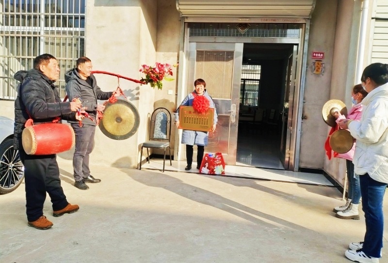 龙庙村用传统花鼓灯表演为荣获“十星级文明户”的家庭送去牌匾。