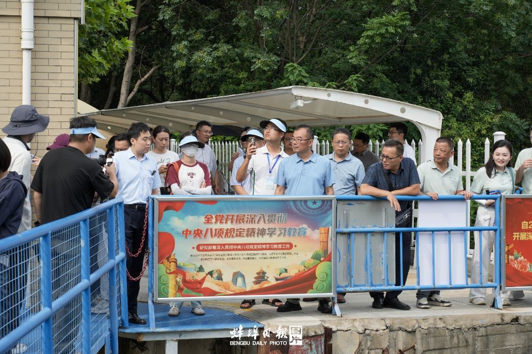8月25日下午,2025年“千里淮河今安澜·行走淮河”网络主题宣传活动采访团一行来到蚌埠闸和蚌埠淮河船闸有限公司采访。(尤靖文)