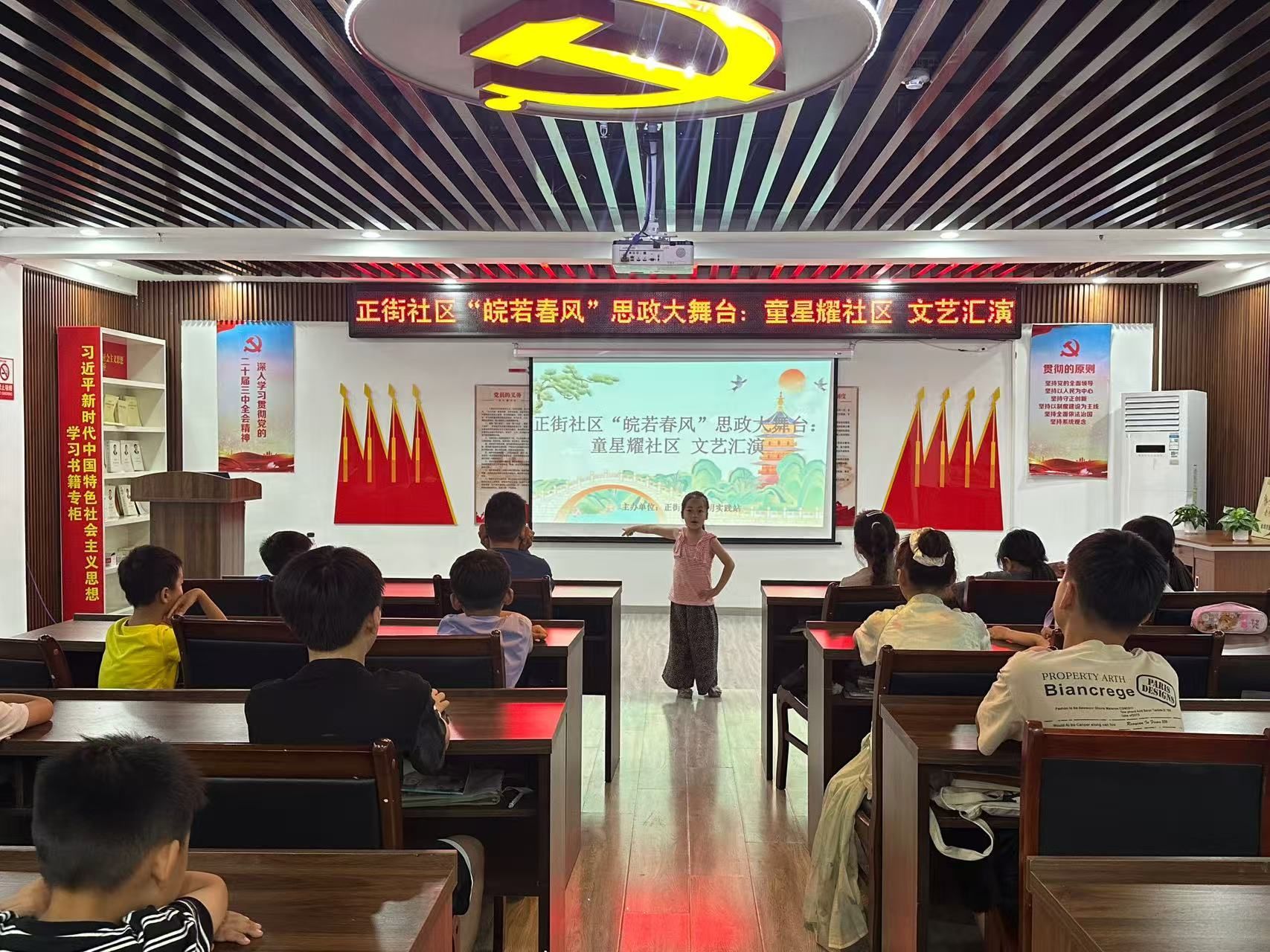金风送爽,家国同庆。在中秋、国庆双节来临之际,为弘扬爱国主义精神,传承中华优秀传统文化,营造团圆祥和、邻里和睦的社区氛围,淮上区淮滨街道正街社区于9月27日开展“童星耀社区”文艺汇演。这场为孩子们量身打造的欢乐盛宴,不仅给他们搭建了自信成长的平台,更让爱国情怀、传统文化浸润童心。