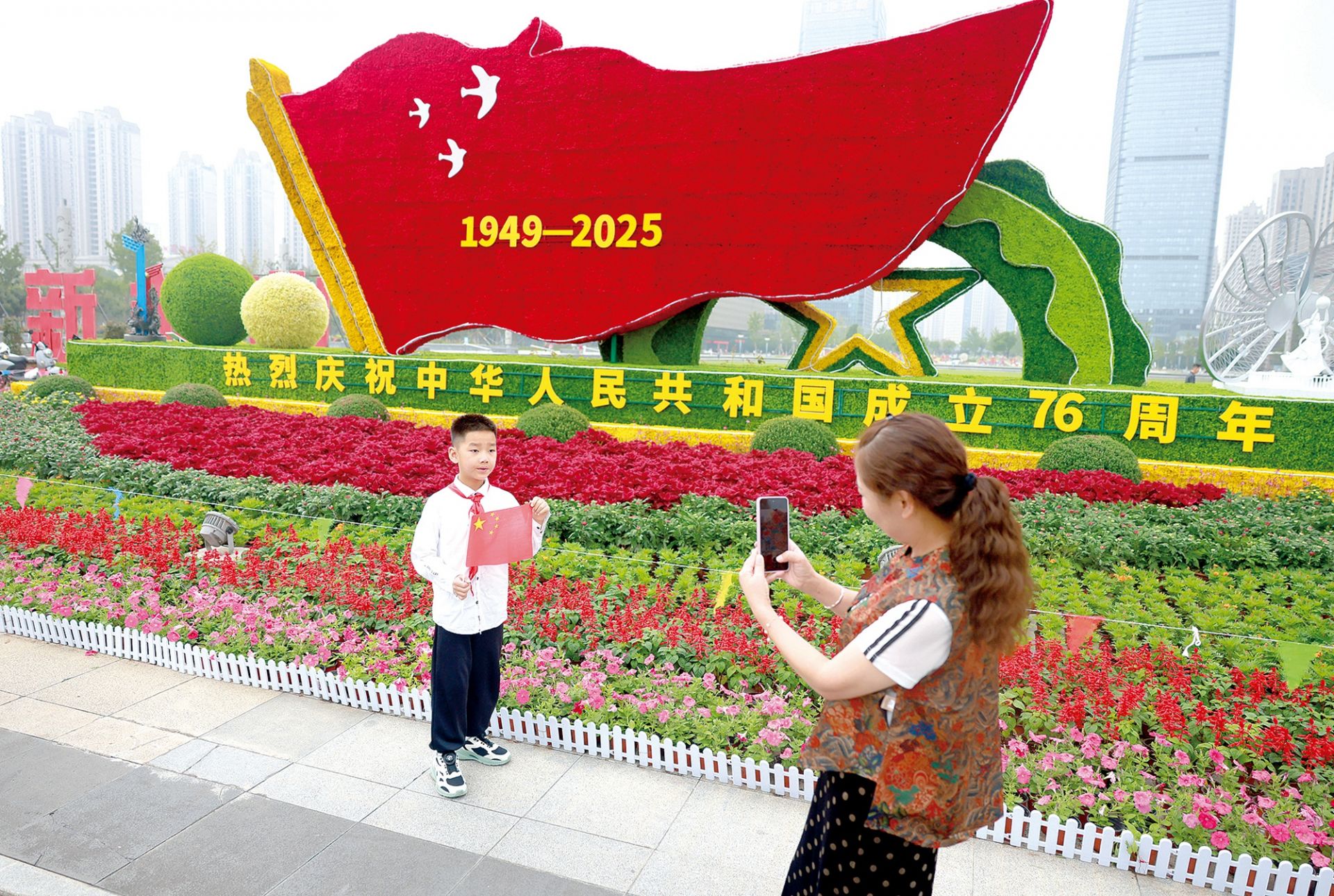 10月1日,市民广场,市民在国庆主题花卉造型前合影。