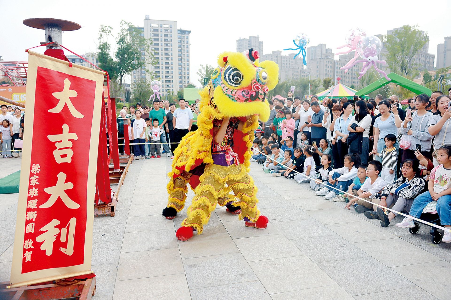 10月4日,游客在小黄山公园观看舞狮表演。