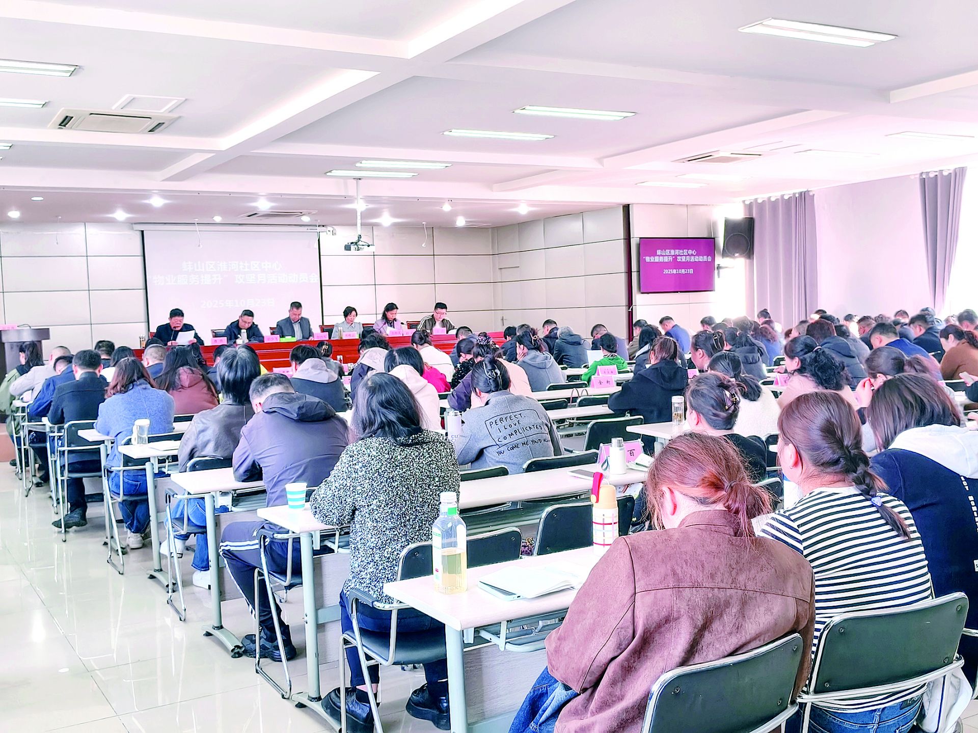 为全面提升辖区物业管理服务水平,切实增强居民幸福感与满意度,10月23日下午,蚌山区淮河社区中心召开“物业服务提升”攻坚月行动动员会。会议在总结1—9月份物业管理工作基础上,正式启动“物业服务提升”攻坚月专项行动。蚌埠市住建局、市物业专班、蚌山区物业办等相关部门负责人出席会议,淮河社区中心班子成员、各社区负责人、执法中队及辖区物业企业负责人等参会。