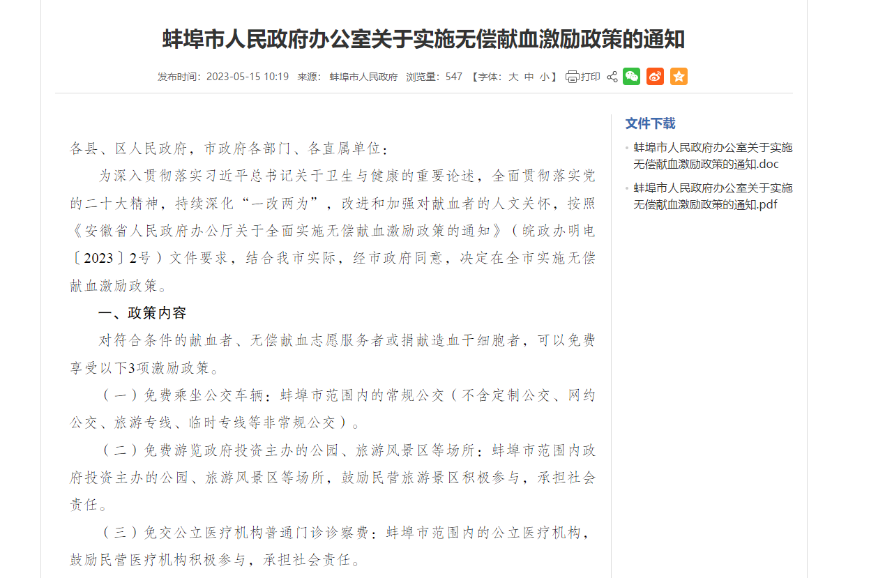 为持续改进和加强对无偿献血者的人文关怀,推动和保障我市无偿献血事业高质量发展,蚌埠市人民政府办公室在广泛征求社会意见建议的基础上,于2023年5月15日印发了《关于实施无偿献血激励政策的通知》,在全市实施无偿献血激励政策。