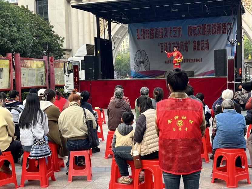 为进一步发挥新时代文明实践阵地作用,不断丰富群众文化生活,由中共蚌埠市委宣传部、市精神文明建设办公室精心策划的“百场文艺进所站”演出活动,于10月27日走进金恒社区新时代文明实践站,为居民朋友带来“泗州戏”等精彩的文艺演出。(邓婷婷)