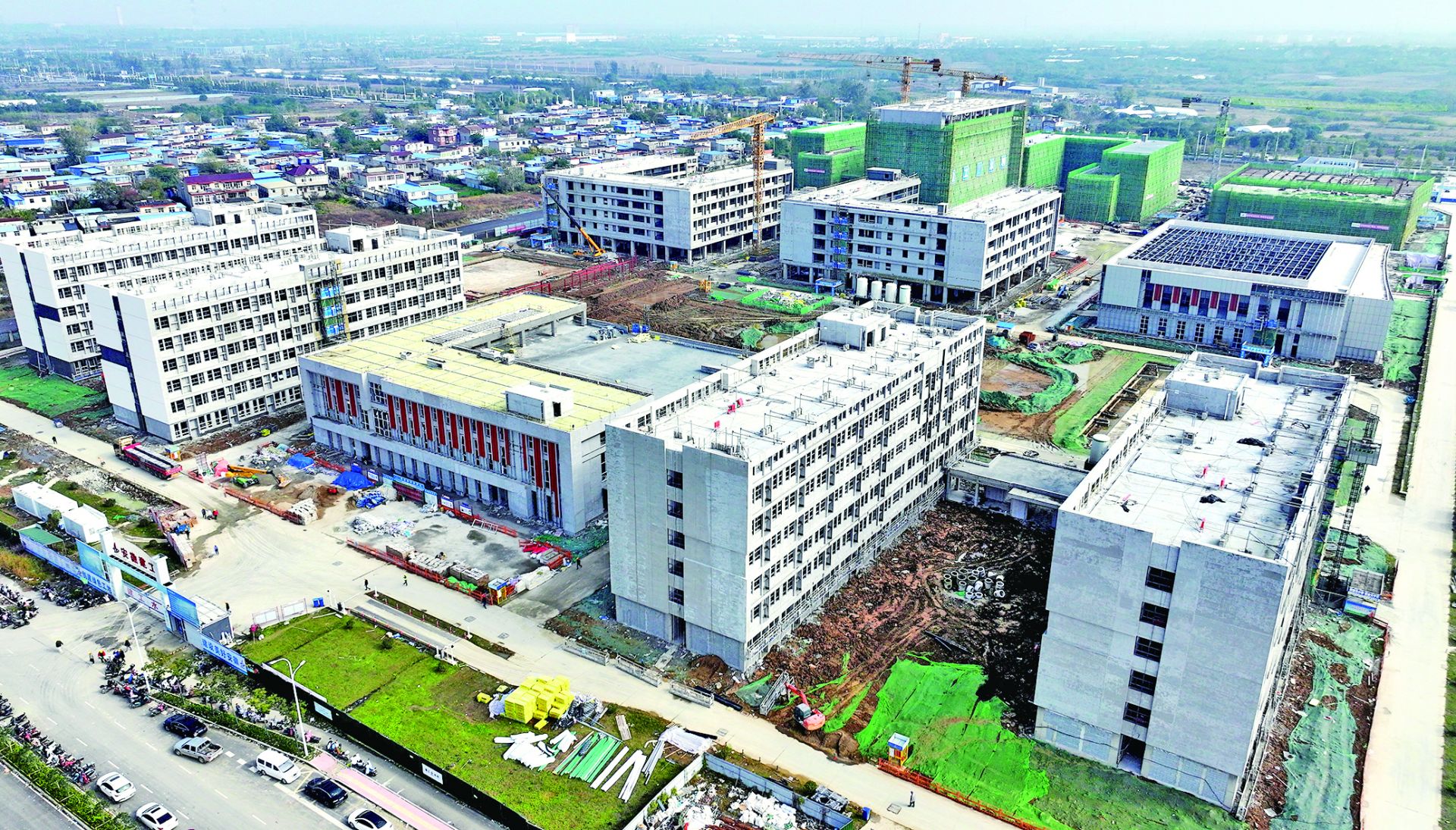 11月10日,蚌埠一中新校区规模显现,建筑工人正在加紧作业。该项目位于经开区临港片区,司马庄路以西、锥子山路以东,总建筑面积约12万平方米,包括教学楼、教学综合楼等。据介绍,按照施工进度,所有单体本周封顶,年底之前基本完成内外装饰。刘晨 摄