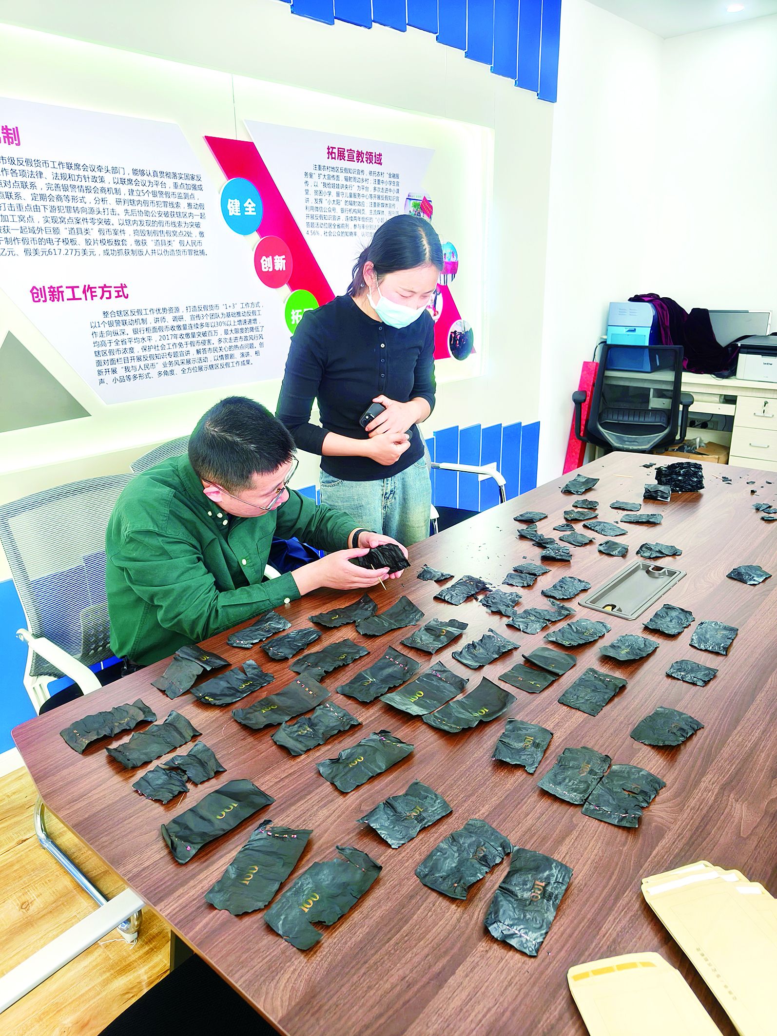 “火烧币易碎,清点、鉴别工作难度大、耗时长。”工作人员细心地将一张张碳化的纸币摊平、拼接,借助专业仪器仔细辨别防伪特征。经过两个多小时的细致工作,最终为于先生成功兑换4400元人民币。