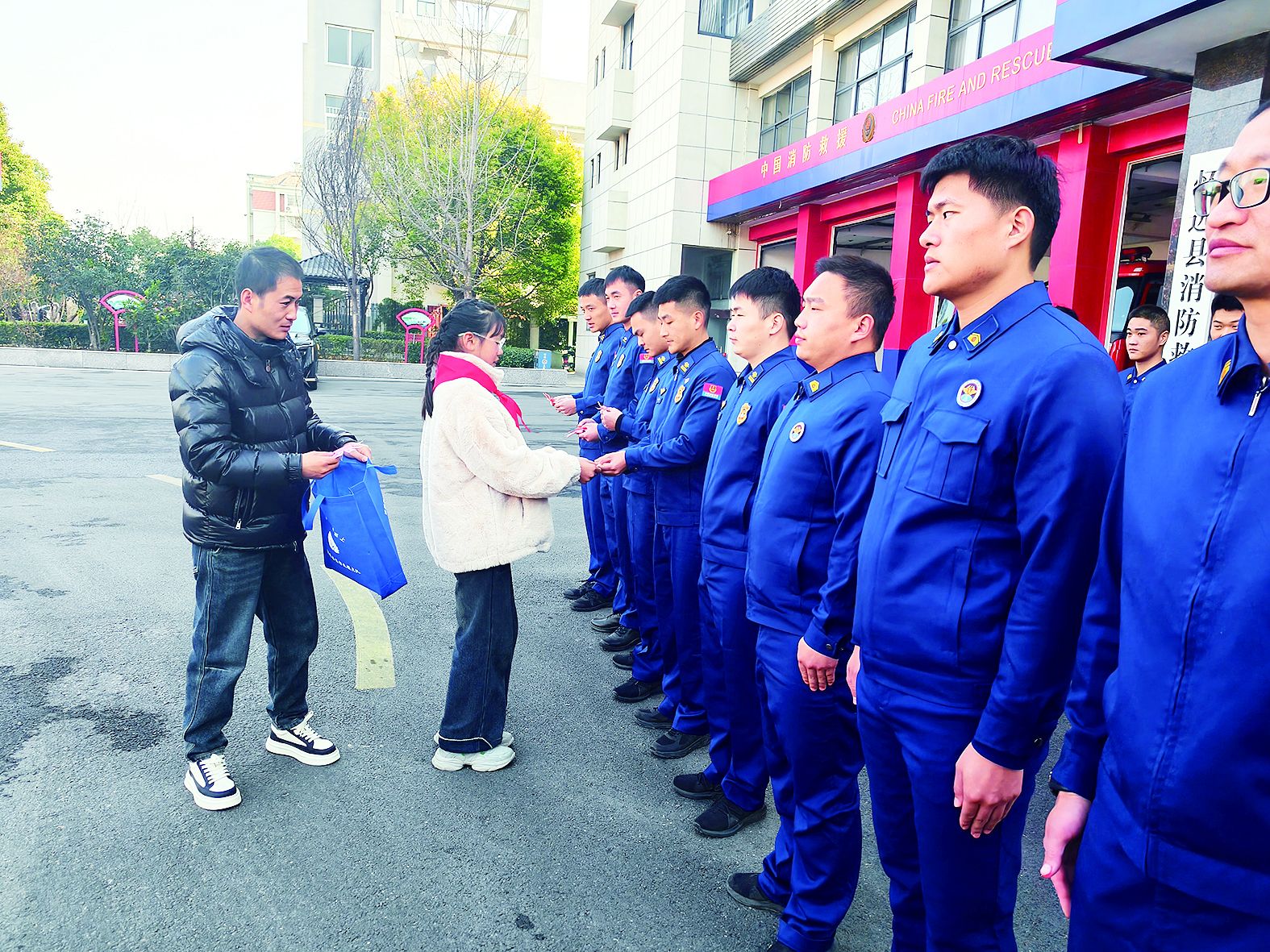 活动尾声,学生代表在老师和志愿者的陪同下,带着全班共同完成的手工作品前往县消防救援大队。“这是我们做的勋章,送给你们这些‘逆行英雄’,希望你们每次都能平安归来。”学生代表将作品郑重递到消防队员手中。阳光下,消防车前,“火焰蓝”与“红领巾”并肩而立,镜头定格了这个温暖瞬间。