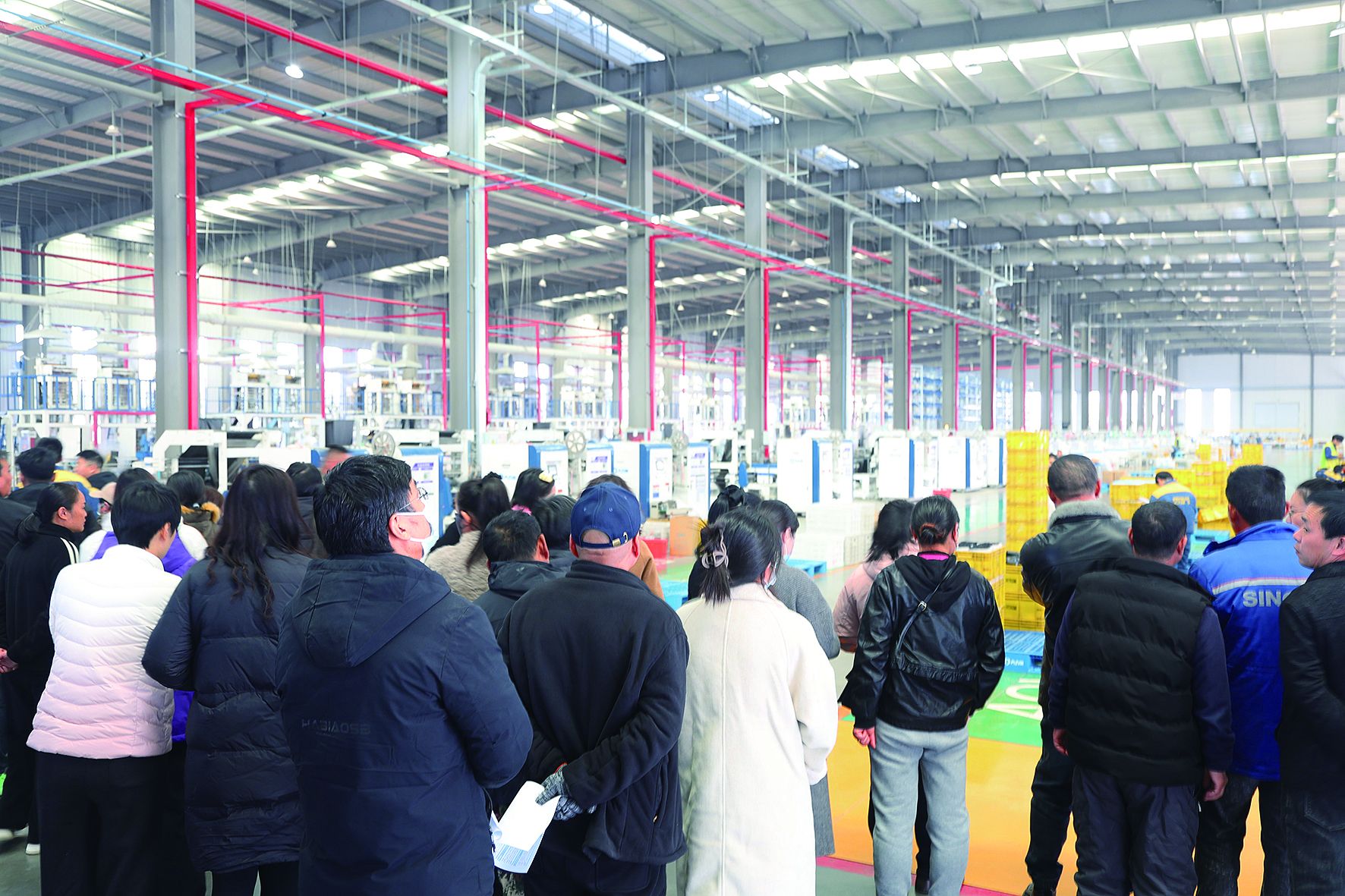 穿过展示区,一行人走进了核心生产车间。机器轰鸣声中,自动化流水线正有序运转,一片片塑料薄膜经过加热、成型、裁剪,很快变成一卷卷环保垃圾袋;另一边,纸杯成型机旁,工作人员熟练地检查着产品质量。“这条生产线主要招操作岗,不需要太高学历,但得细心、能吃苦,上岗前我们会做免费培训。”企业技术专员站在流水线旁,指着不同工位介绍,“像这个分拣岗位,主要负责检查成品有没有瑕疵,中间有休息时间,大家要是感兴趣,现在就能看看操作流程。”居民们围着工位,有的掏出手机拍视频,有的凑上前跟工作人员请教细节,原本对“工厂岗位”的陌生感,在实地观摩中渐渐消散。