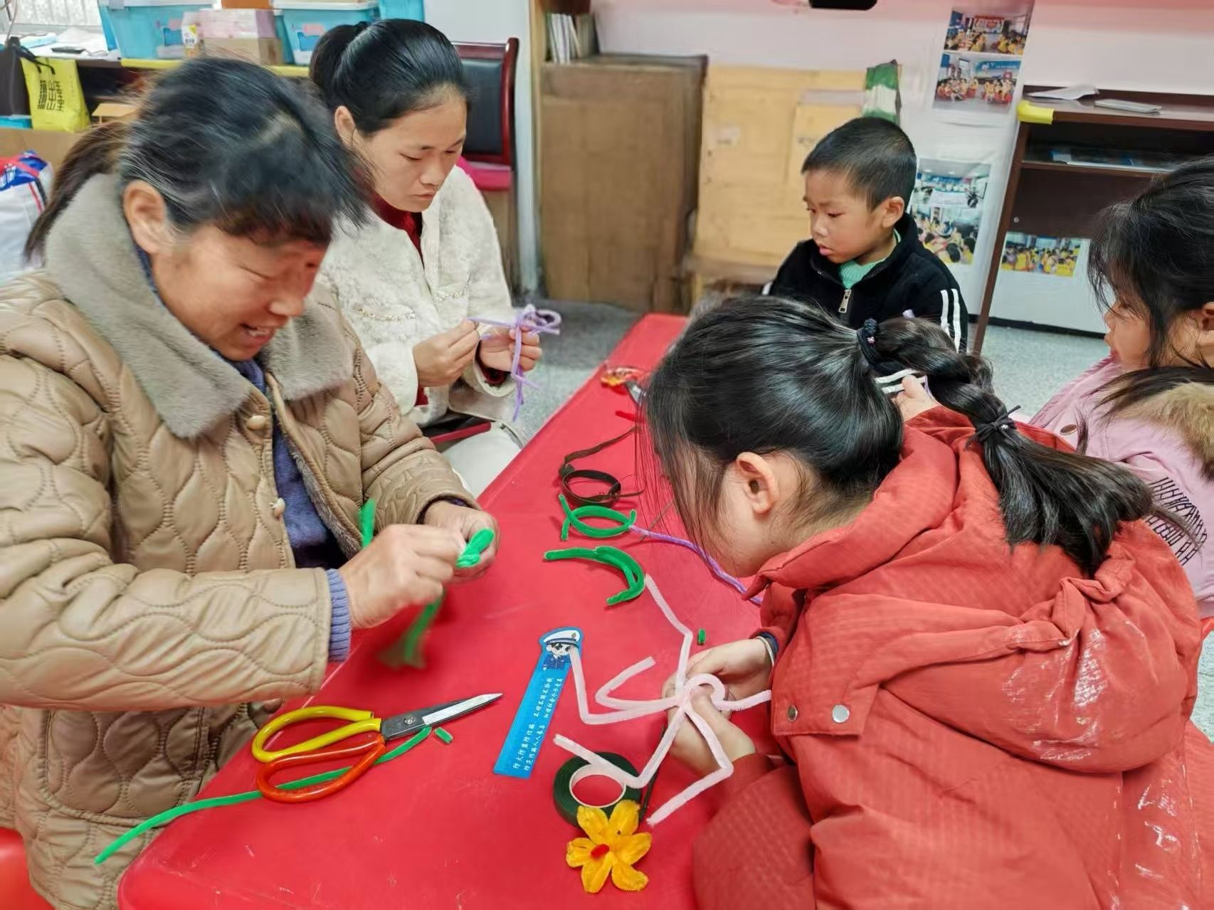 活动伊始,志愿者结合“护苗·绿书签”行动,用通俗语言讲解不良信息危害、正版读物识别等知识,通过趣味问答引导家长履行监护责任,陪伴孩子健康成长。随后,手工制作环节拉开帷幕,志愿者示范扭扭棒塑形、花瓣组装等技巧,桌上彩纸、扭扭棒、胶带等材料一应俱全。