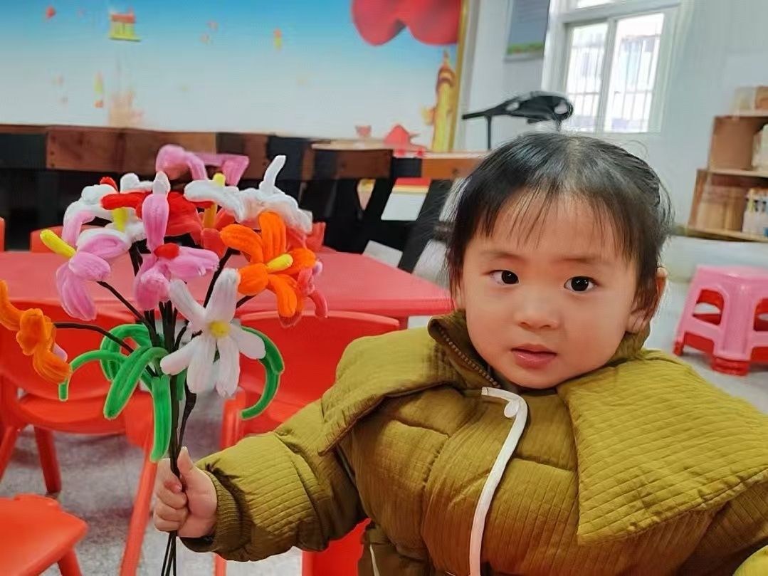亲子之间默契配合,家长耐心辅助孩子裁剪、缠绕、粘贴,孩子们发挥奇思妙想,用彩色棉纸做成各种各样的花瓣,将扭扭棒拧成花茎。“妈妈,我要做一朵白色小雏菊!”稚嫩的话语中满是欢喜,小手与大手在材料间穿梭。遇到花瓣粘贴不牢、颜色搭配不均等难题时,志愿者会及时上前指导。现场欢声笑语不断,指尖翻飞间,向日葵、玫瑰、小雏菊等模样的手工花渐渐成型。