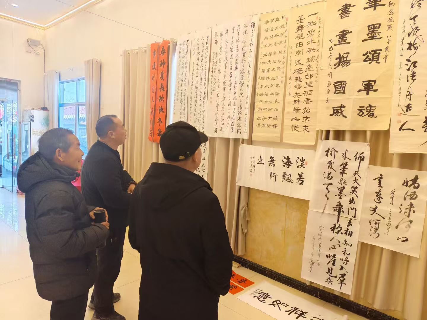 活动现场气氛热烈,翰墨飘香。书画艺术家们展纸挥毫,沉浸于创作之中:有的精心绘制主题鲜明的书画作品参与展览,有的即兴为前来参观的群众书写并赠送一副副寓意吉祥、充满年味的春联。红纸墨迹间,既有书法艺术的传统韵味,也流淌着喜迎新春的暖意与欢愉。