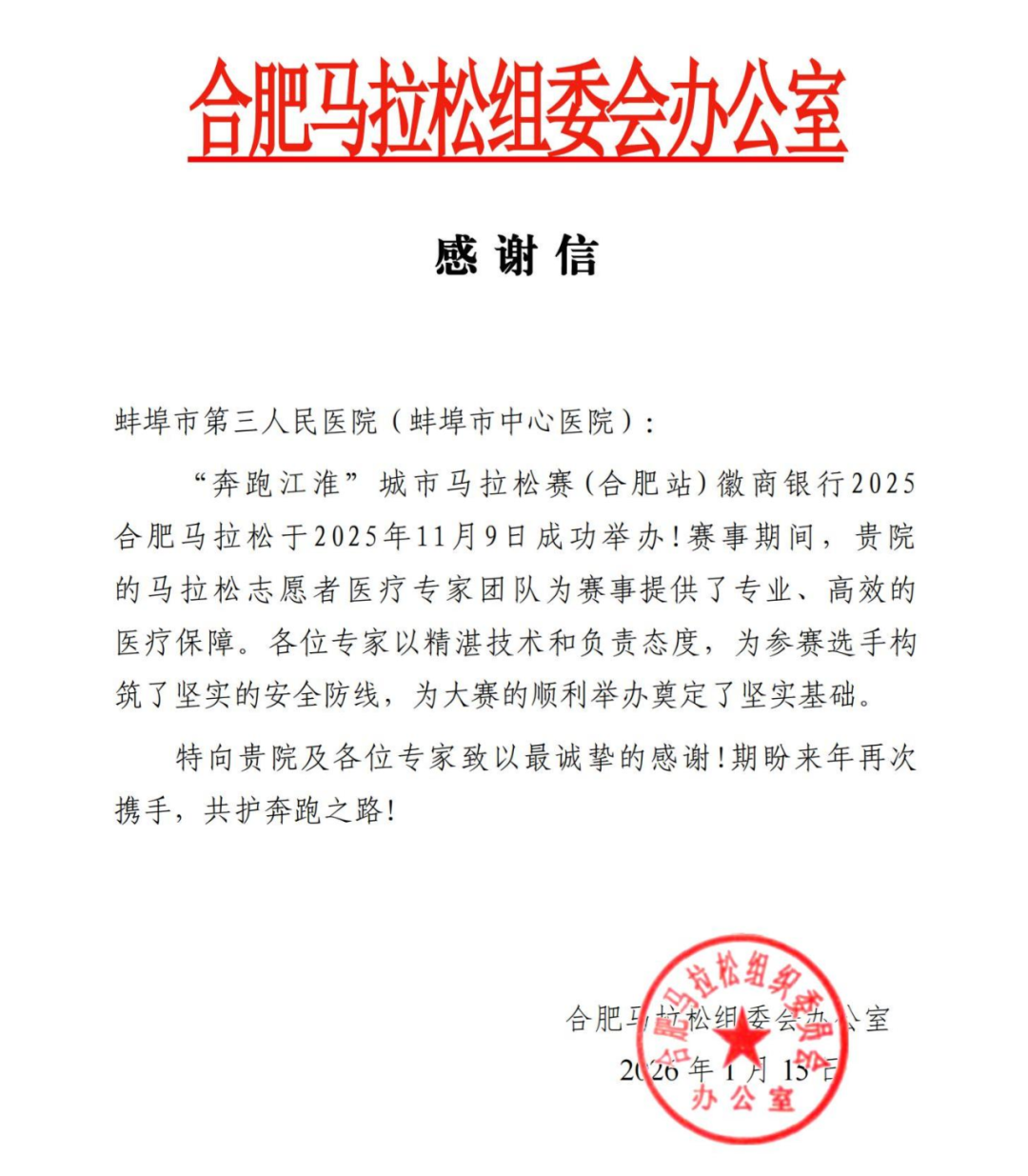 近日,蚌埠市中心医院(蚌埠市第三人民医院)收到了一封来自合肥马拉松组委会的感谢信。信中提到,在2025年11月9日举办的“奔跑江淮”城市马拉松赛(合肥站)中,医院派出的马拉松志愿者医疗专家团队为赛事提供了专业、高效的医疗保障,为大赛顺利举办奠定了坚实基础。