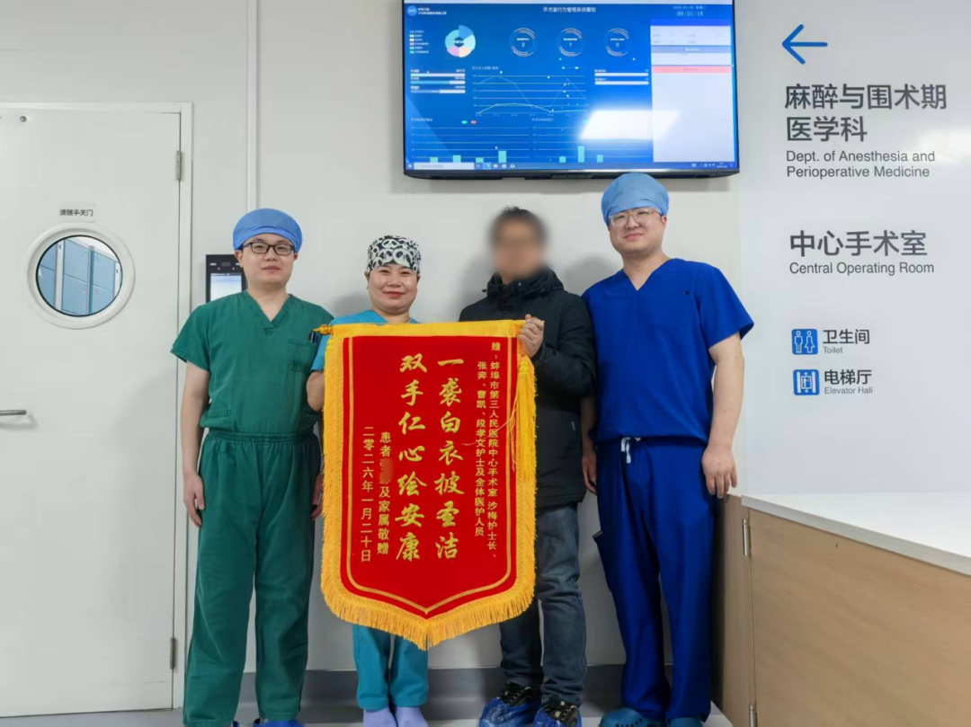 1月20日,蚌埠迎来了2026年的第一场大雪。清晨,积雪已深达十几厘米,一位患者家属徒步数里,踏雪而来,将一面鲜红的锦旗送到了蚌埠市中心医院(蚌埠市第三人民医院)手术室门口。