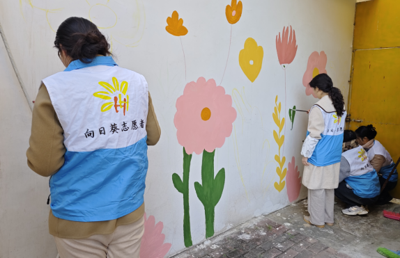 为给社区环境注入艺术气息,告别单调沉闷,“向日葵”志愿服务队启动“彩绘家园”微改造行动,让冰冷墙面、灰暗石墩变身传播文明的“立体画布”。在社区志愿服务小广场,志愿者们以“向阳而生、情暖社区”为主题,在路障石墩上勾勒出一幅幅生动图案。原本毫不起眼的石墩,摇身变成憨态可掬的“萌墩墩”,既守住了安全警示的功能,又为社区增添了童趣活力。在小区老旧墙面处,志愿者精心打造“向阳而生、花开满墙”主题文化墙,让斑驳墙面蜕变为展示社区文化的鲜活窗口。