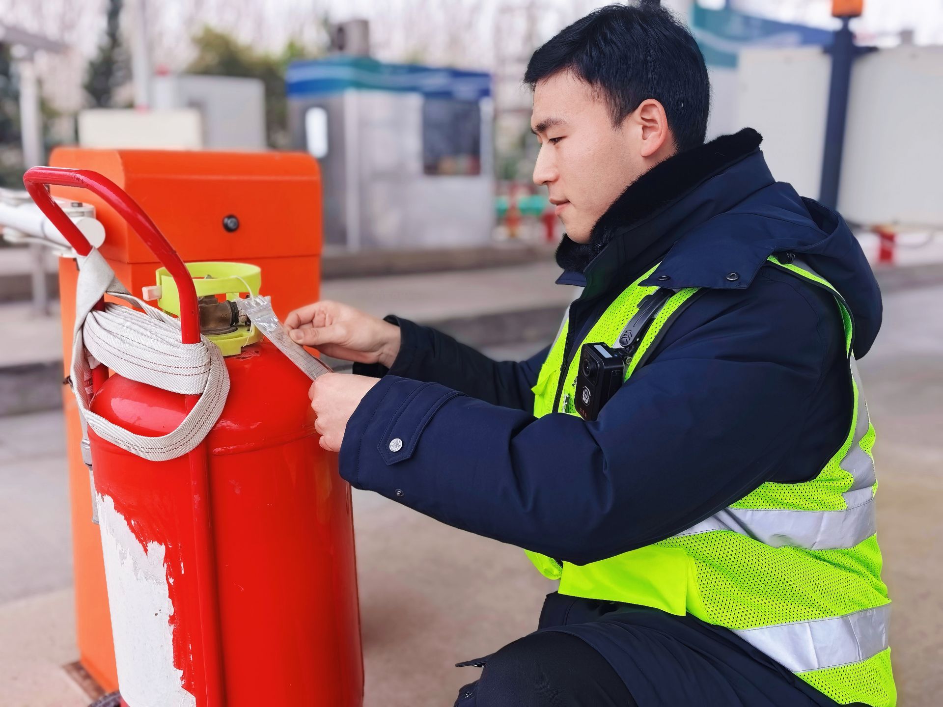 官塘站安全员认真检查道口消防设备,确保设施完好、运转正常。