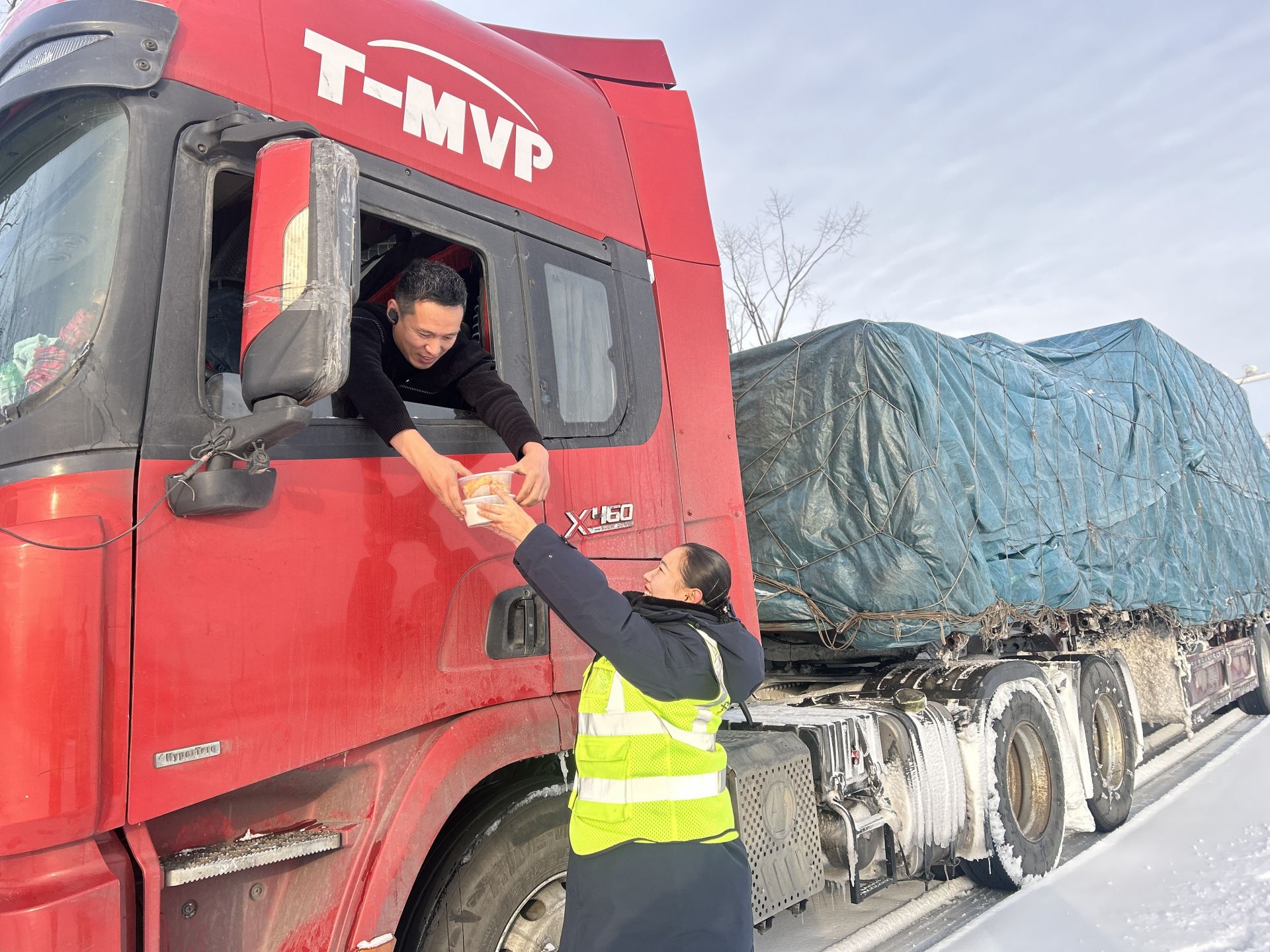 固镇东站杨亚雯为司乘人员递上热水与爱心早餐,传递温暖关怀。