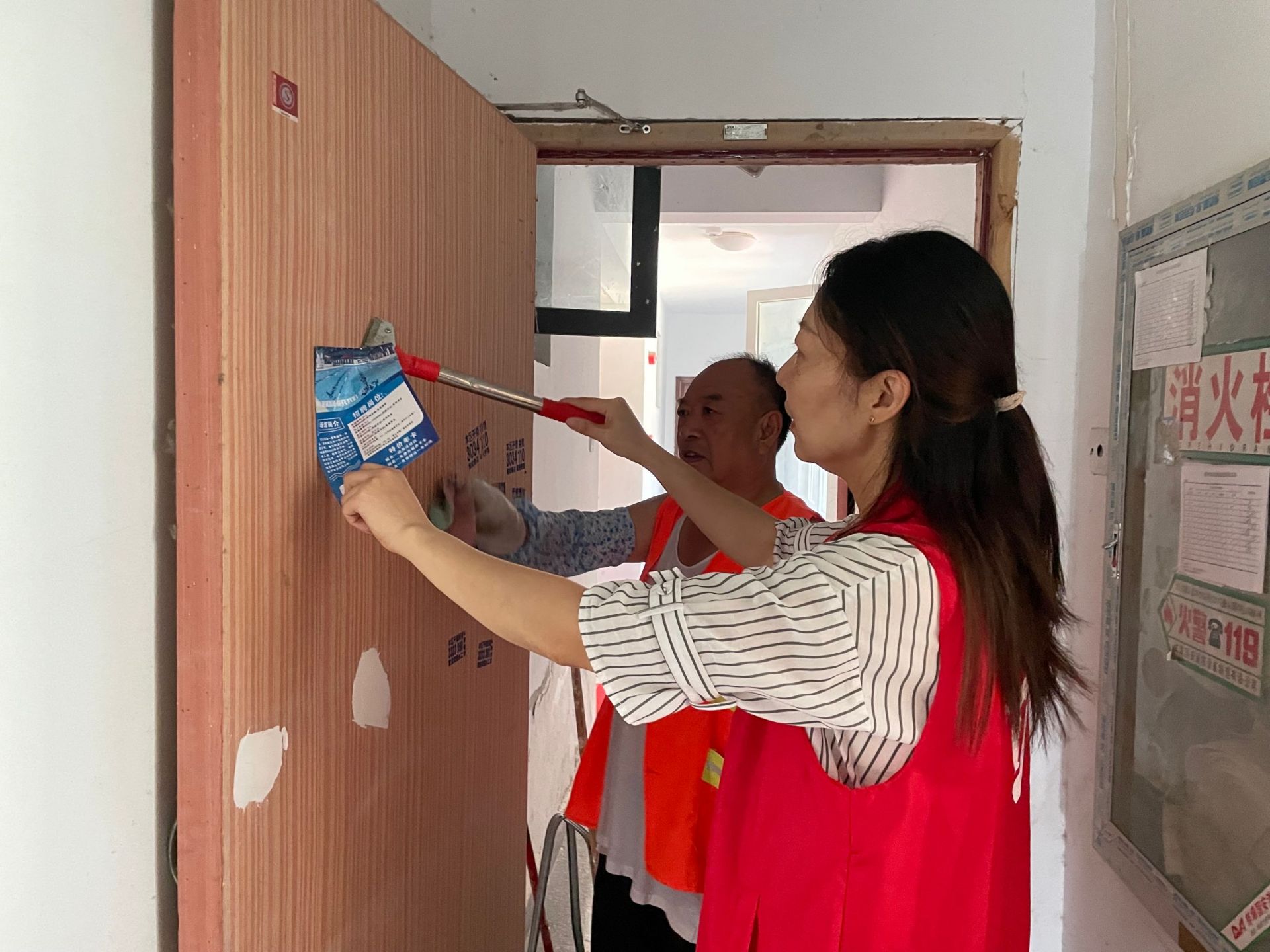 为了给小区居民营造一个整洁的居住环境,清理行动中,社区工作者和志愿者对辖区道路及小区楼道内的“小广告”进行逐层逐户检查,发现一处,清理一处。志愿者在清理“小广告”过程中,还积极向居民普及环保知识。