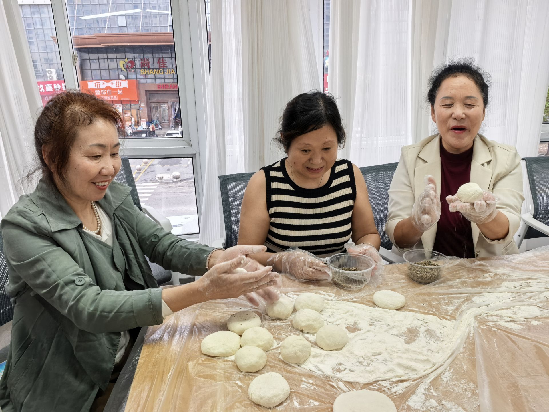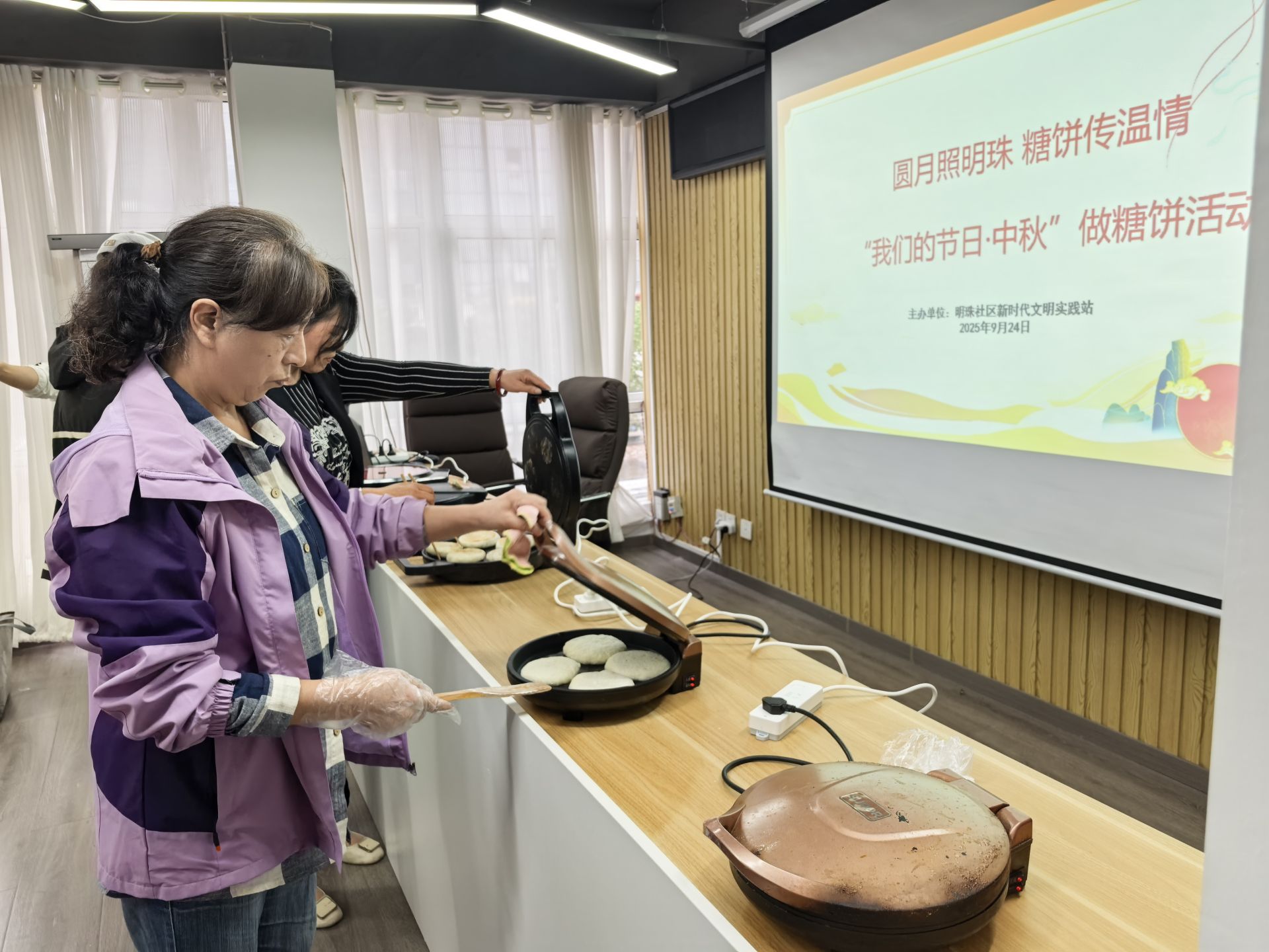 活动现场,志愿者首先介绍了中秋节的历史文化背景和传统习俗。随后,面点师提前备好了包糖饼所需的各种原料和工具,居民纷纷上手,揉面、分团、擀皮、包馅,每个步骤都井然有序,邻里们欢声笑语,气氛融洽,将心底里那一份浓浓的祝福和节日的欢乐,一起“包”进了香甜的糖饼中。接着,饼胚被送入电饼铛里烘焙,等待着金黄的蜕变。不一会儿,糖饼的香气四溢,唤起了大家对传统节日的无限怀想。居民们围坐一起,品尝着这份共同劳动的成果,分享着生活中的欢乐,邻里间的情谊在这一刻如同糖饼一般,甜蜜而绵长。