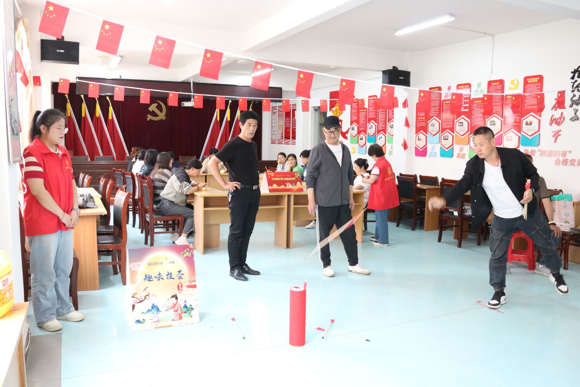 趣味投壶游戏区前,志愿者详细讲解了投壶的规则,投壶游戏不仅让居民们体验了传统民俗的乐趣,更在欢乐的氛围中传递了中秋团圆的寓意,让大家在互动中收获了快乐,也结识了更多邻里朋友。