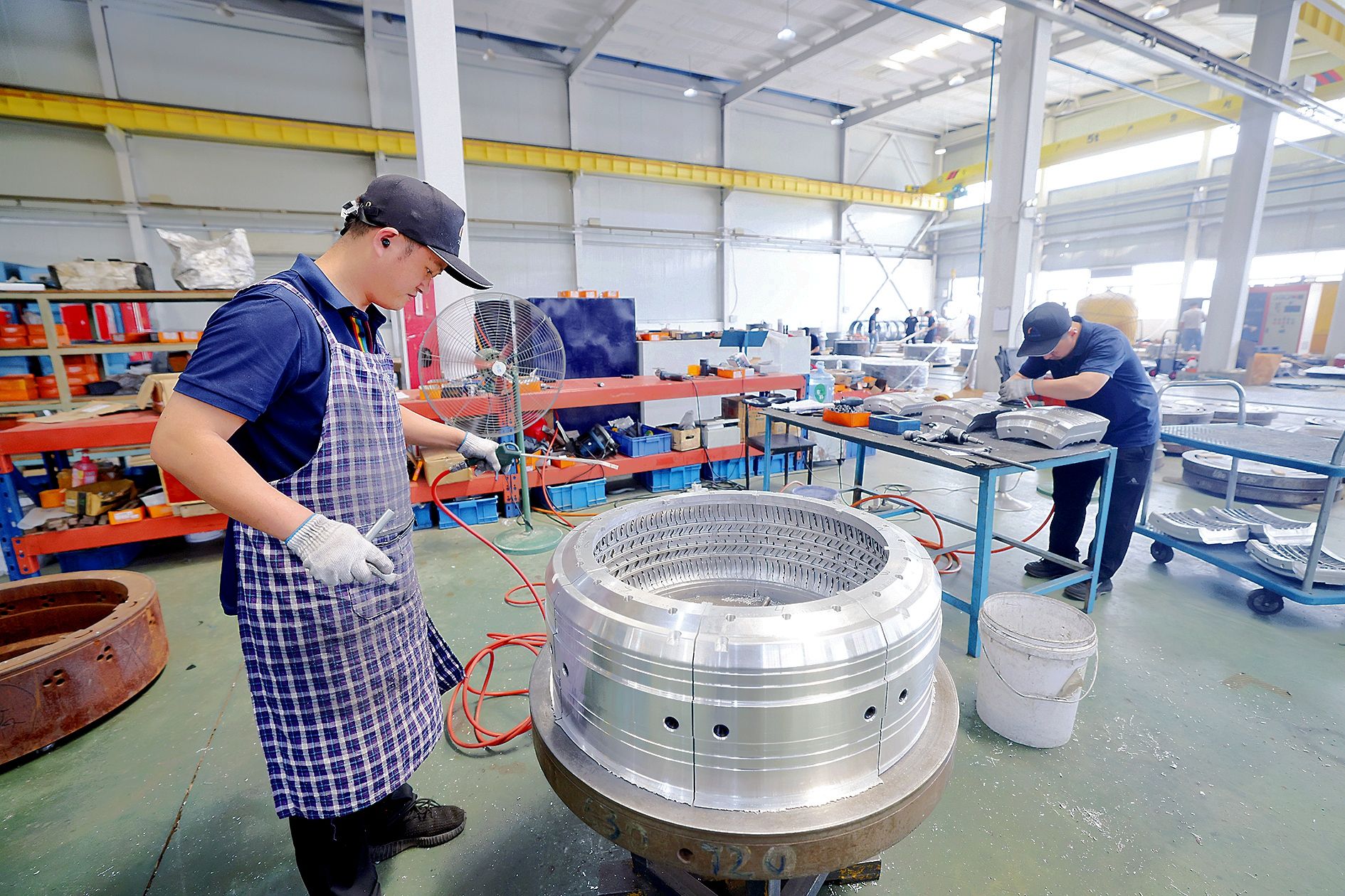 深蓝航空液体火箭智能制造基地建设项目现场,员工加工关键零部件。