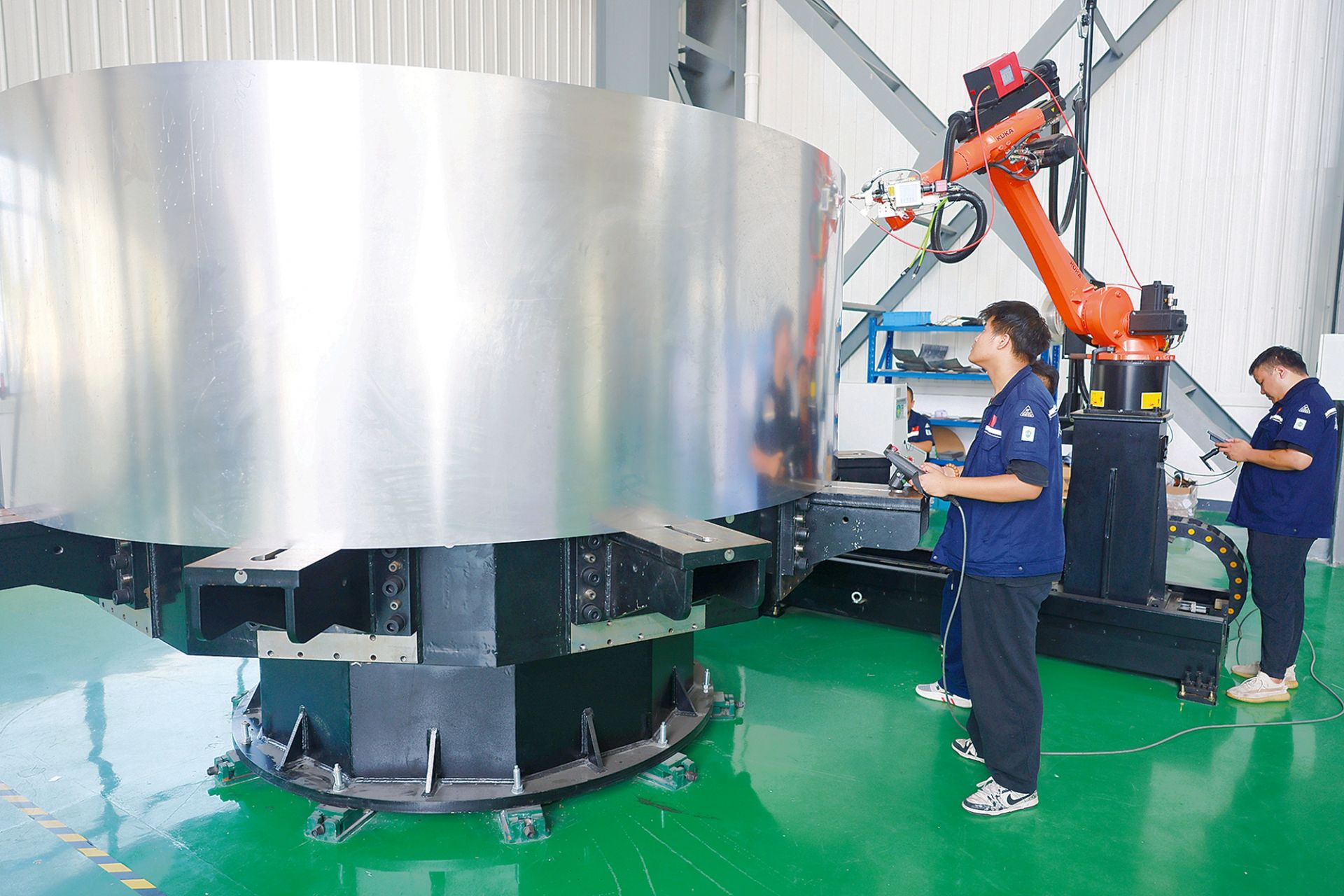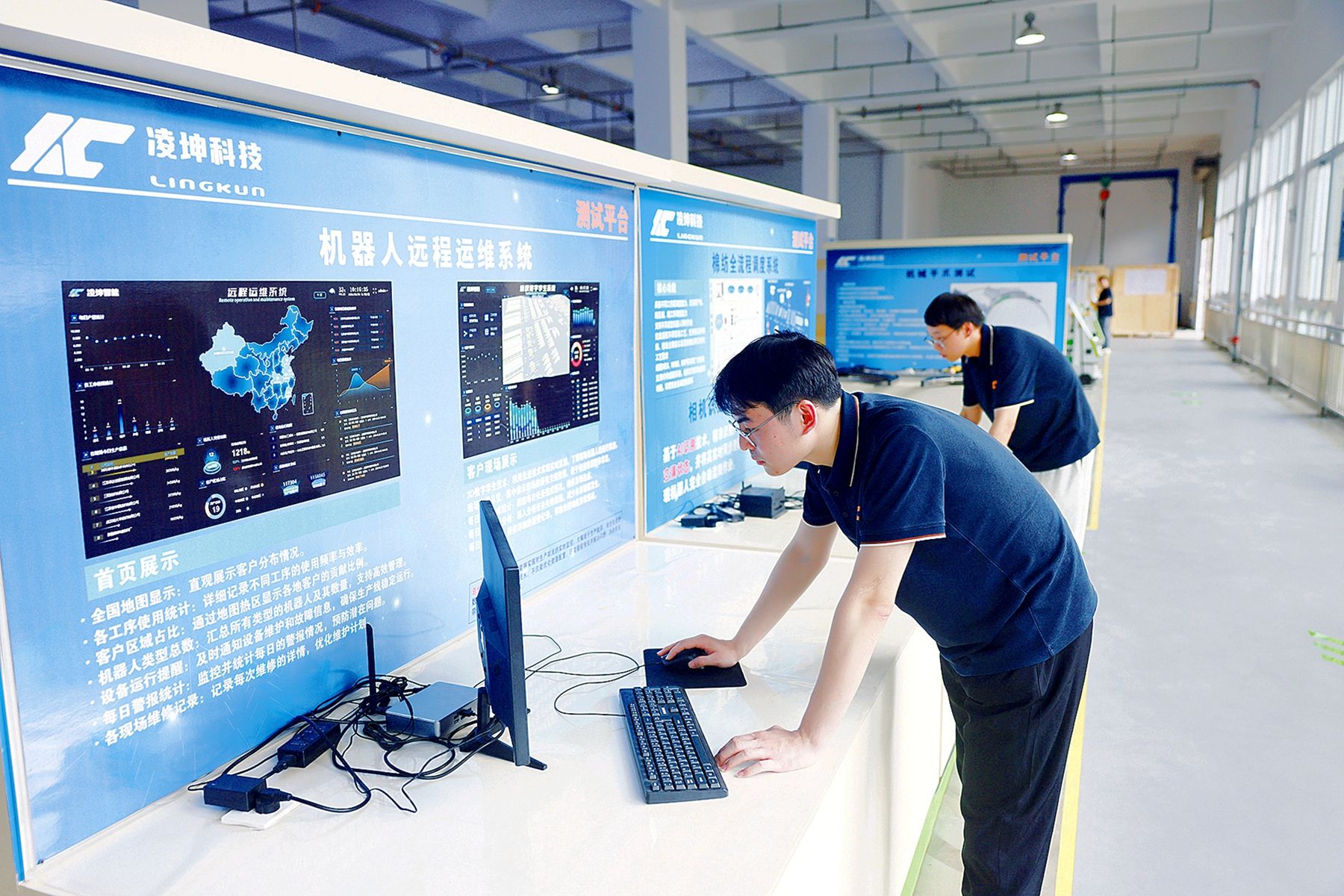 凌坤智能自动化清洁维护设备创新、研发、生产基地项目现场,技术人员通过网络实施机器人远程运维。
