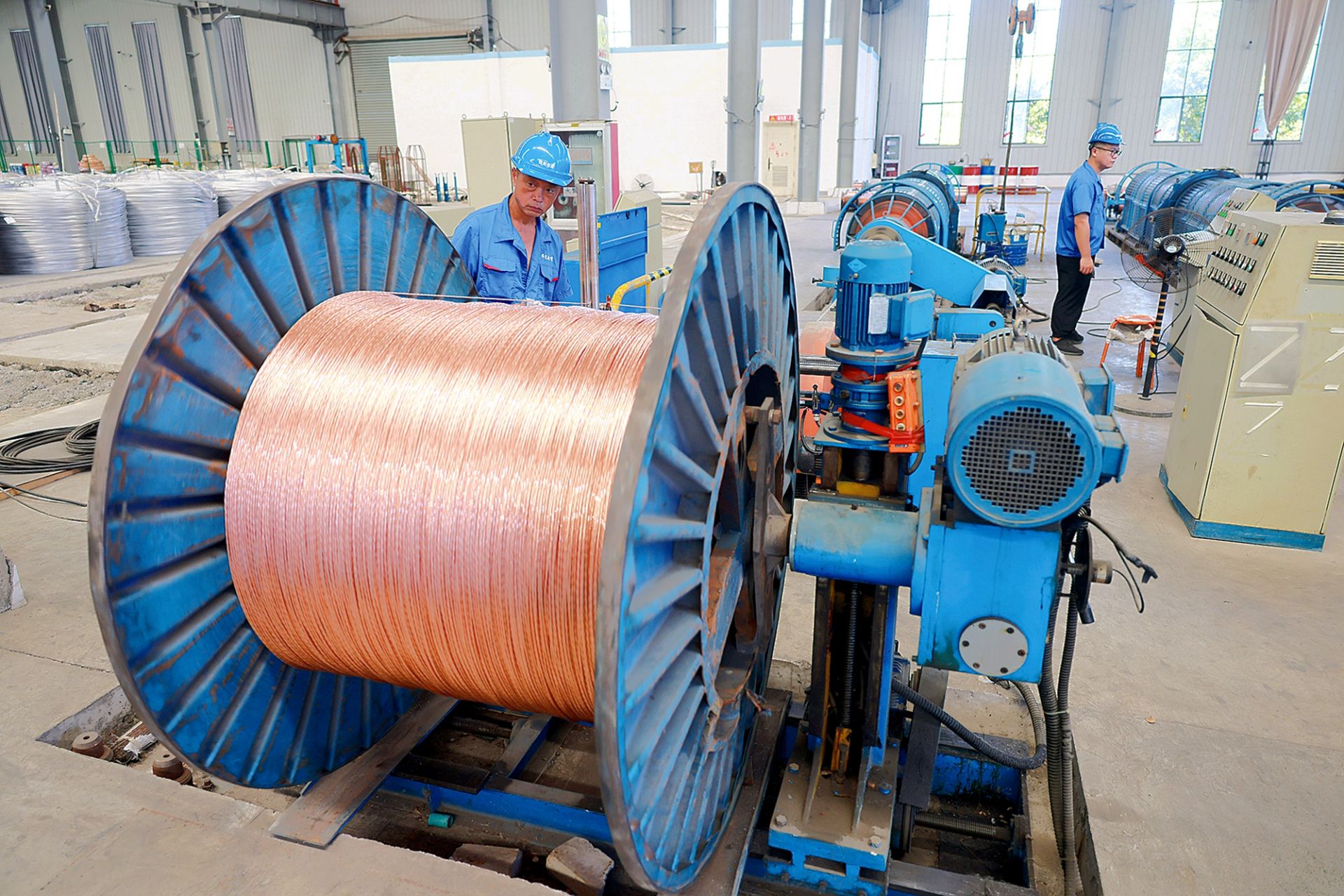 伟光电缆员工查看生产设备运转情况。