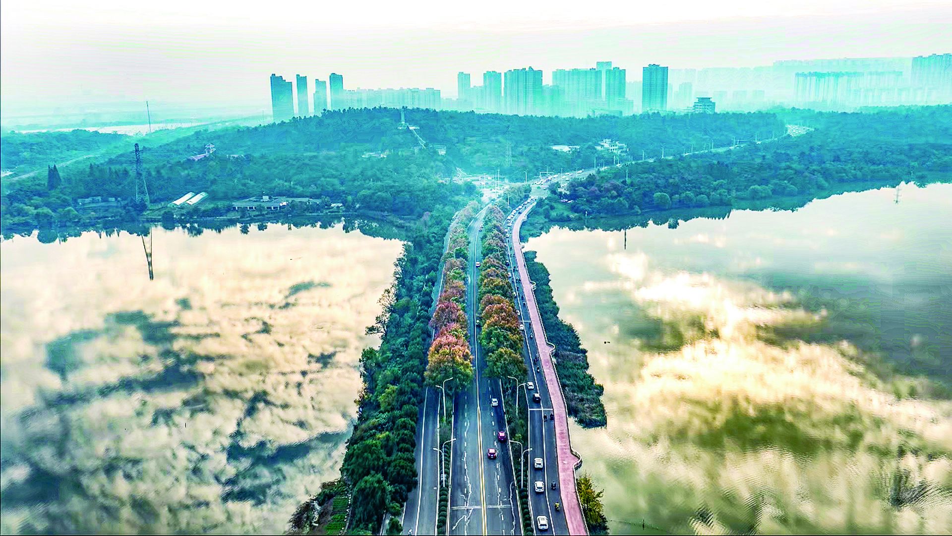 11月13日清晨,龙子湖珍珠桥畔秋意盎然。航拍镜头下,桥侧树木晕染金黄,与澄澈湖水交相辉映。湖面如镜,清晰倒映流云、林带与城市建筑群,构成“水天一色”的美景。 (陈昂)