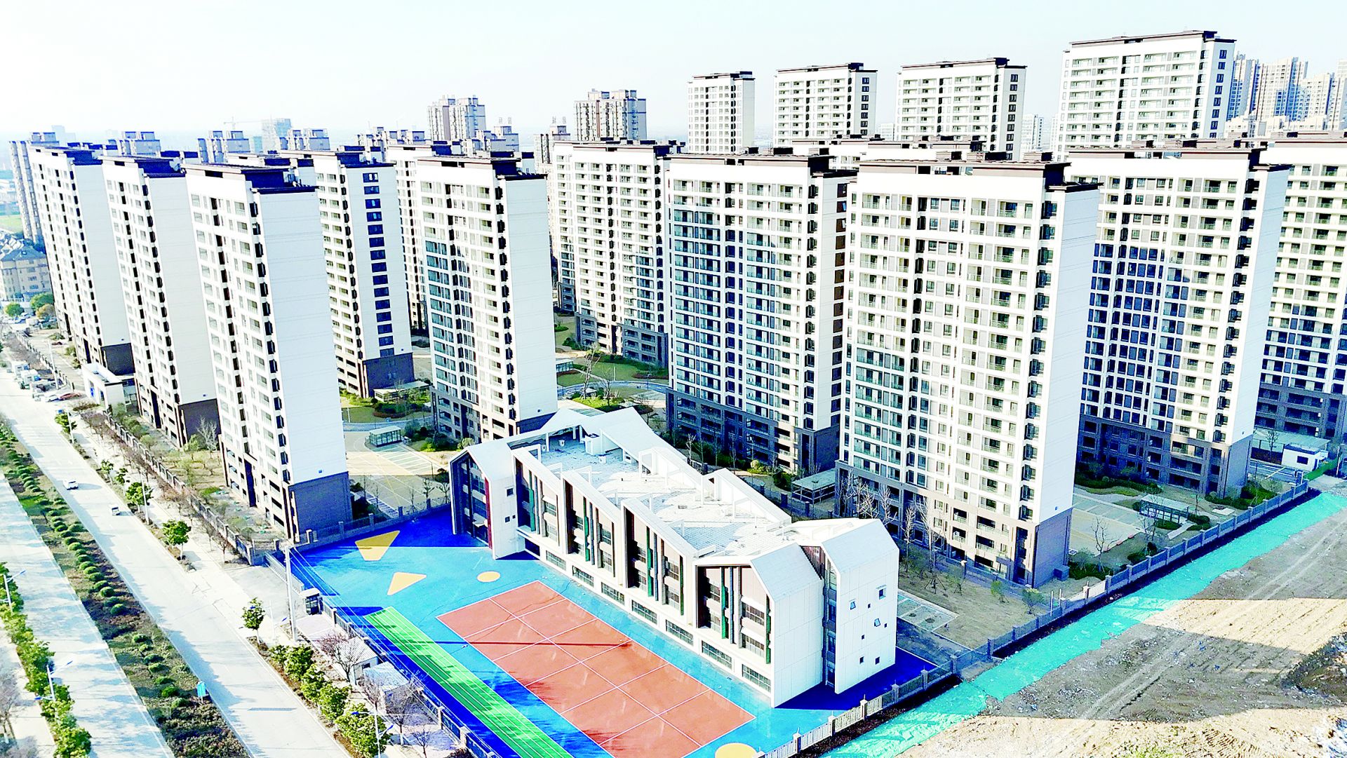 该安置区位于健康路与学海路交叉口、县第二中学南侧,总建筑面积25.5万平方米,是怀远县规模较大的集中安置项目。此次竣工的室外工程涵盖雨污水管网、环形道路、景观铺装、生态绿化等全套配套设施,总占地面积近10万平方米,其中绿化面积3.6万平方米,打造出“推窗见绿、步移景异”的宜居环境。