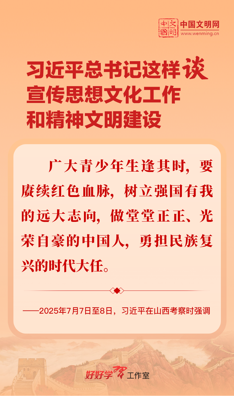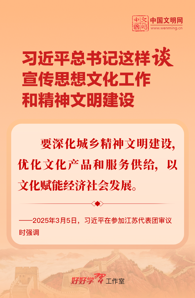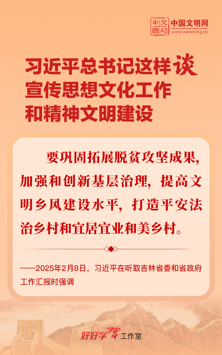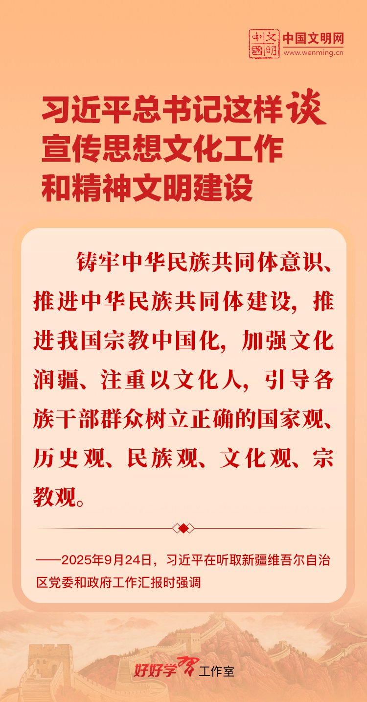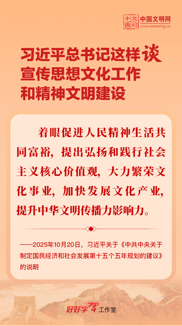 习近平总书记高度重视宣传思想文化工作和精神文明建设,念兹在兹、饱含期许。2025年,习近平总书记对宣传思想文化工作和精神文明建设作出一系列新的重要指示,发表一系列重要论述。本网从这一年的头条报道中辑录部分内容,让我们一起深入学习领会,更加自觉学习贯彻习近平文化思想,更好担负起新时代的文化使命。