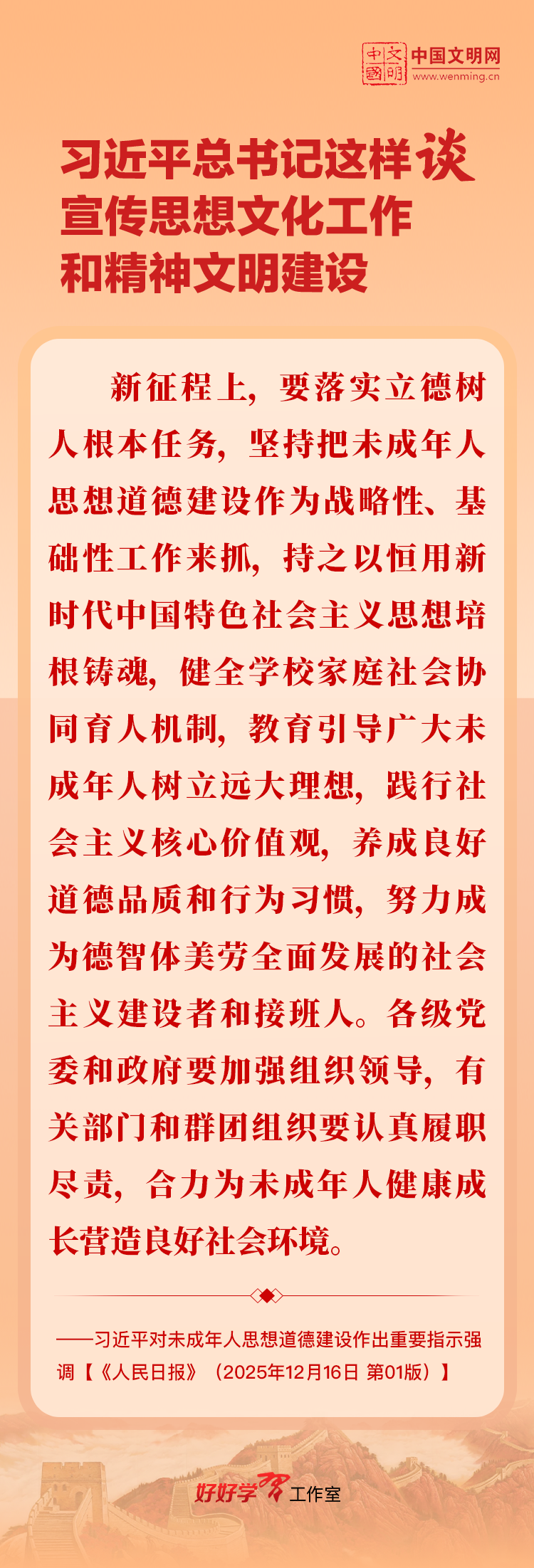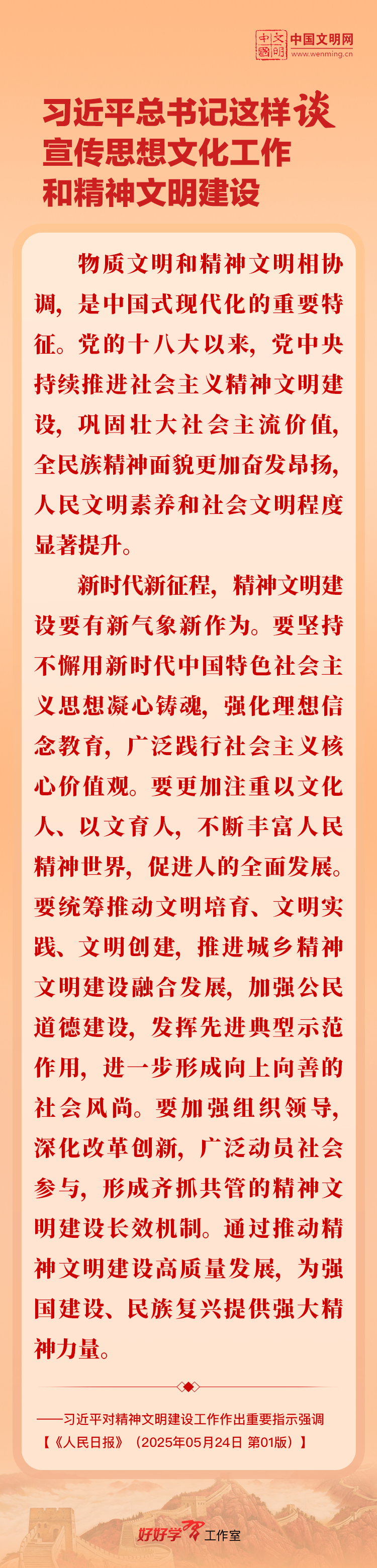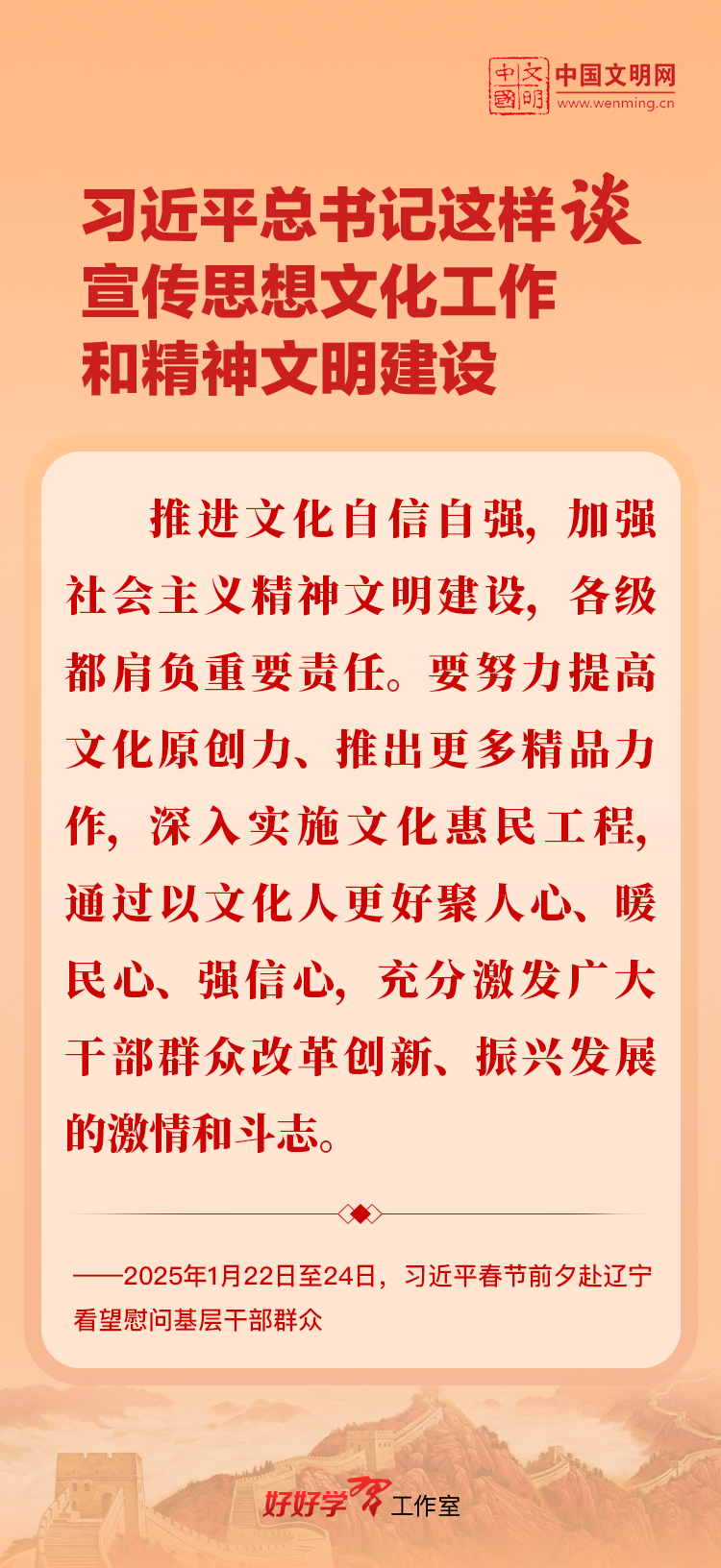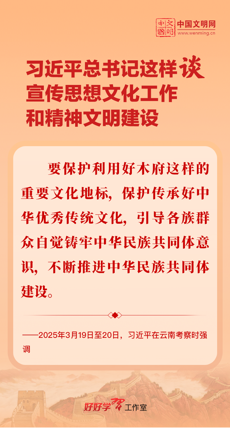 习近平总书记高度重视宣传思想文化工作和精神文明建设,念兹在兹、饱含期许。2025年,习近平总书记对宣传思想文化工作和精神文明建设作出一系列新的重要指示,发表一系列重要论述。本网从这一年的头条报道中辑录部分内容,让我们一起深入学习领会,更加自觉学习贯彻习近平文化思想,更好担负起新时代的文化使命。