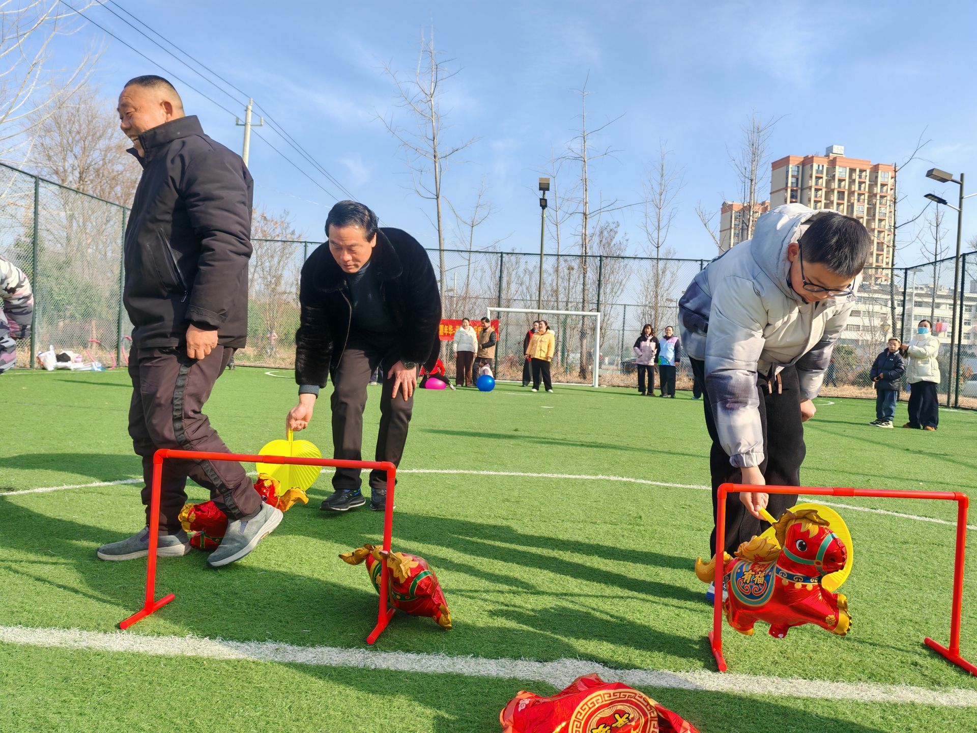 活动现场,袋鼠跳、赶马入厩、趣味背夹球、一圈到底、蒙眼敲锣等项目轮番上演。袋鼠跳环节,居民们化身“活力袋鼠”,在跳跃接力中比拼速度与默契;蒙眼敲锣项目里,选手们在队友指引下,克服眩晕挑战,精准敲响铜锣,引得阵阵喝彩。大家在轻松欢乐的氛围中,忘却忙碌,尽情享受运动快乐。