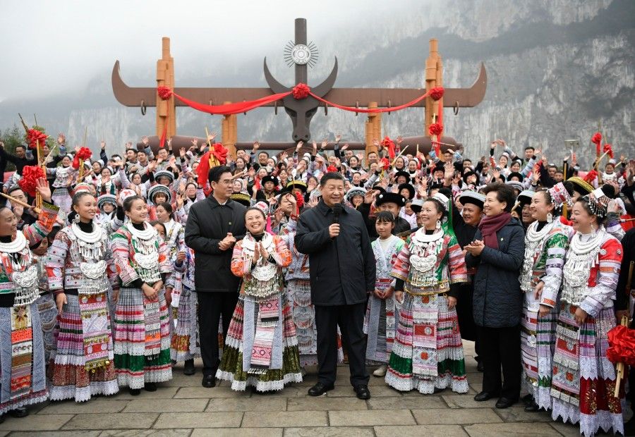 这是2021年2月3日下午,习近平总书记在毕节市黔西县新仁苗族乡化屋村文化广场上,向全国各族人民、港澳台同胞和海外侨胞拜年。新华社记者 李学仁 摄