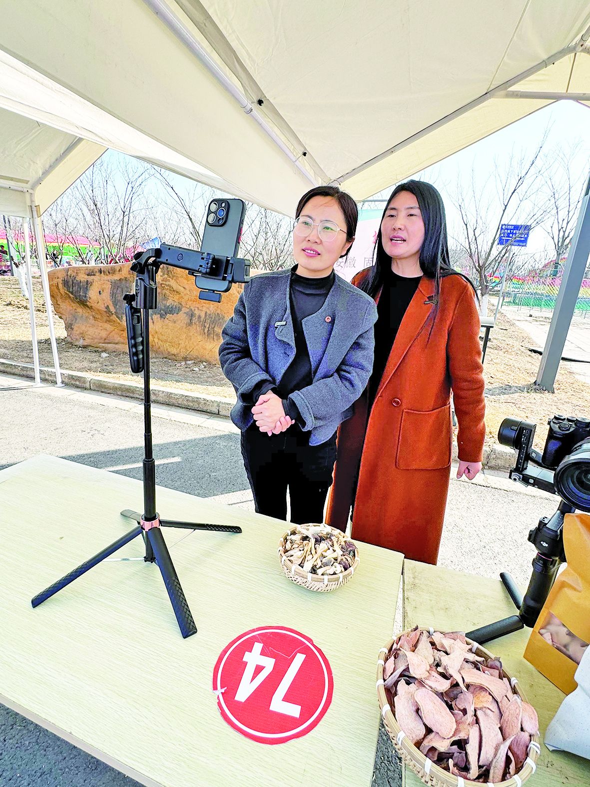 在热闹的摊点中,一处挂着“村干部小丁”和美乡村直播间横幅的摊位格外引人注目。一部架起的手机、桌面上两大碗土特产,构成了一个简易却充满活力的直播间。镜头前,一位身着朴素外套、笑容爽朗的女士,正手持一碗赤松茸干货,对着手机屏幕热情地介绍着。