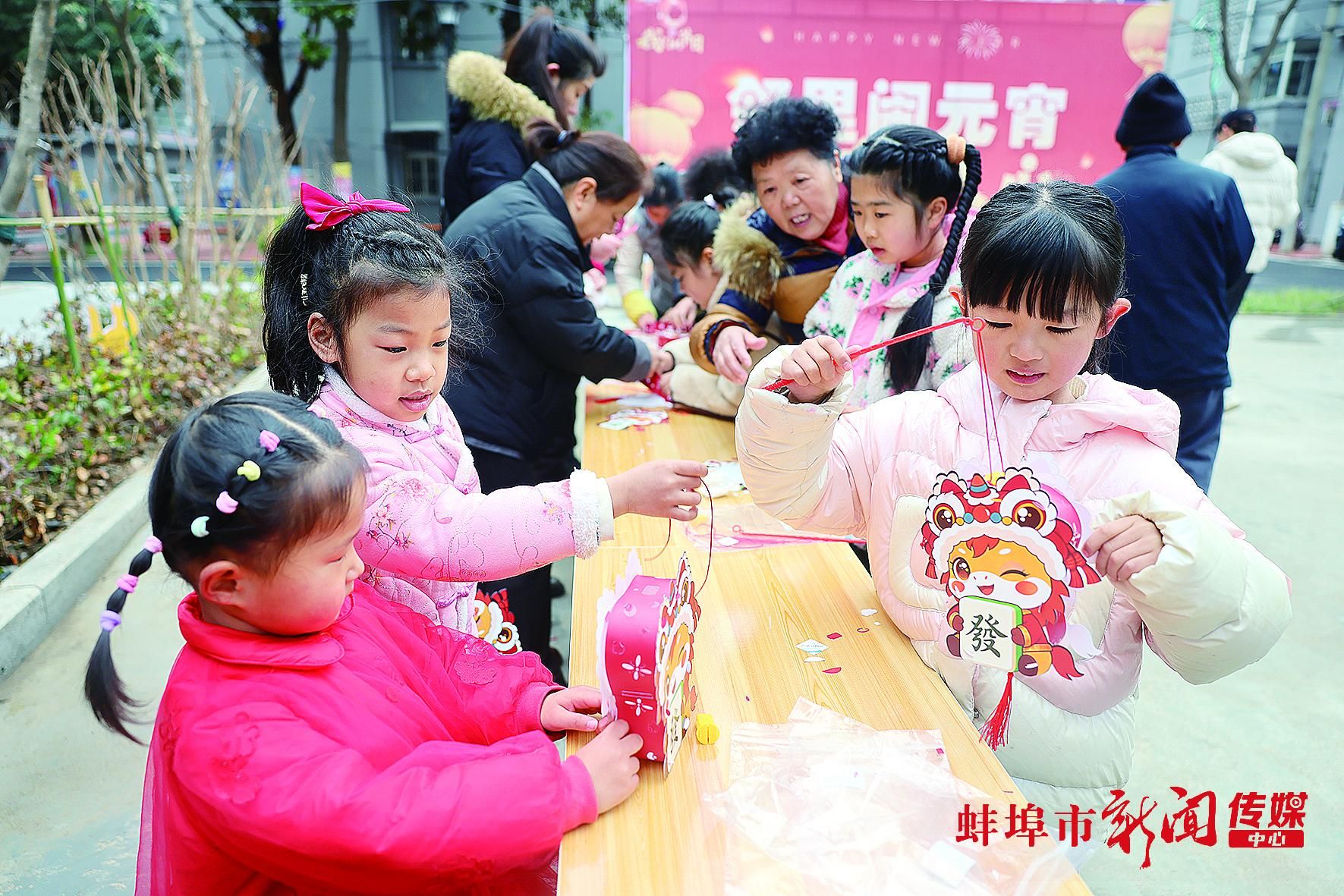 日前,安财东苑小区,龙子湖区东升街道地委宿舍社区孩子们在手工制作灯笼。当日,该社区开展“我们的节日·元宵”主题活动,传承中华优秀传统文化,营造喜庆祥和的节日氛围,丰富居民精神文化生活。刘晨 摄
