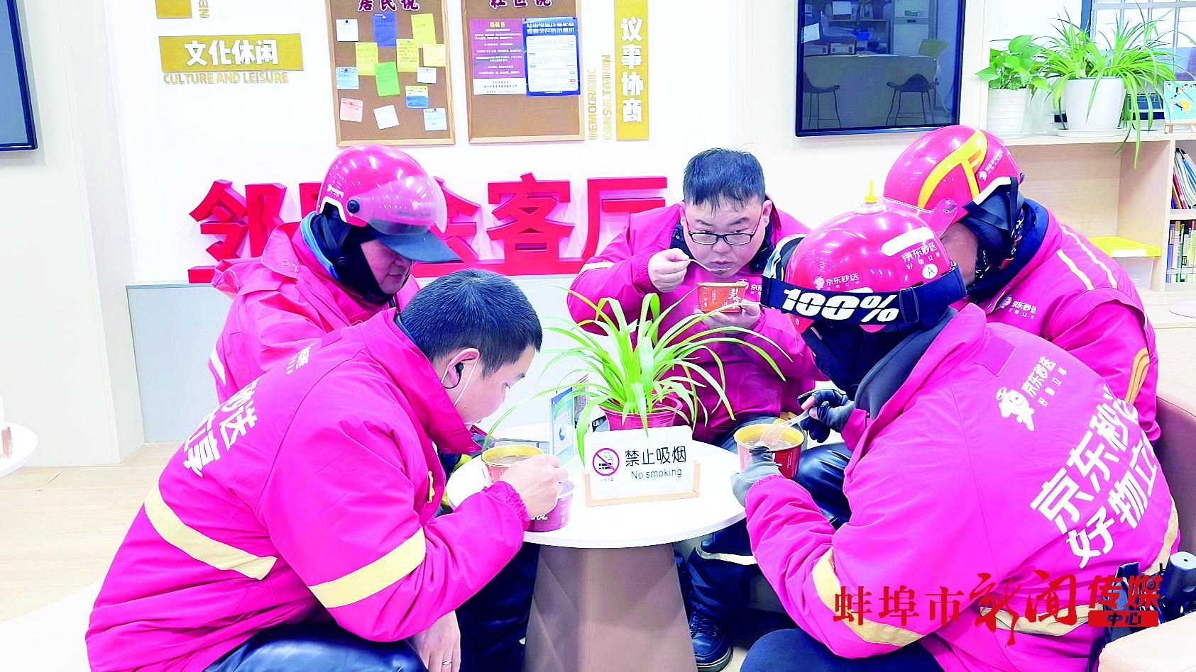 上午8时许,龙子湖区曙光社区“党群驿站·淮畔新港湾”就热闹了起来。驿站内,微波炉、充电插排、医药箱一应俱全,桌上还摆放着护膝等“暖冬礼包”。
