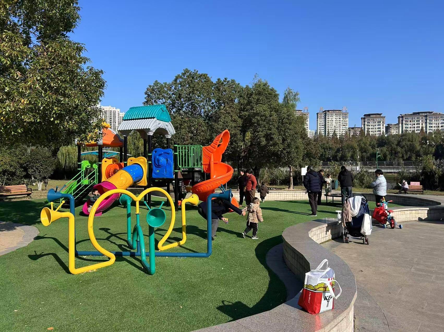 “慢点跑,别摔着!”在色彩鲜艳的塑胶地面上,市民朱振芳正护着一岁半的小孙子蹒跚学步。小家伙对公园里造型独特的太空滑梯充满好奇,稚嫩的笑声回荡在绿林间。
