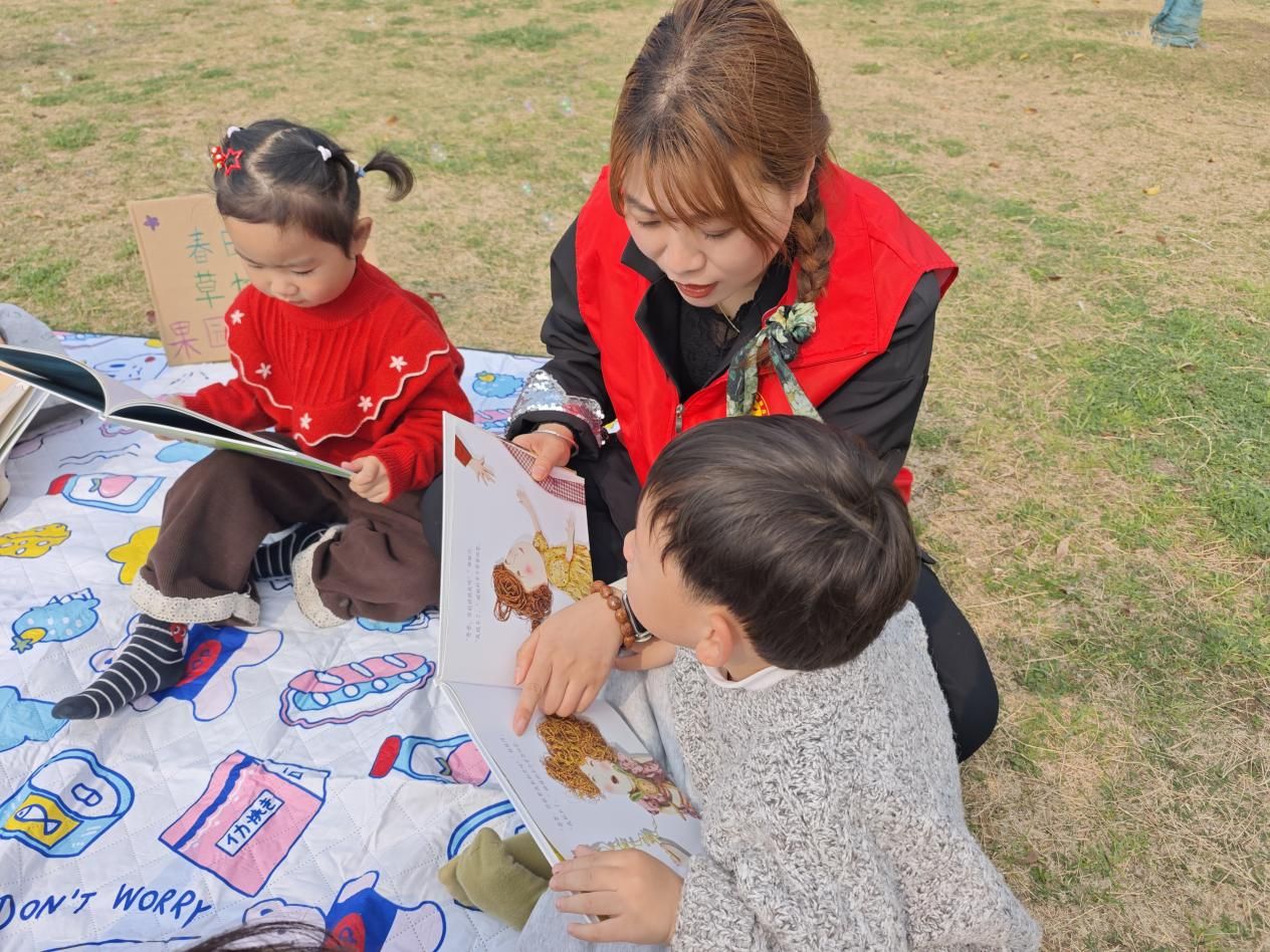 活动现场,微风轻拂、花香萦绕,为读书会营造出最惬意舒适的氛围。志愿者与小朋友们围坐成圈,手捧色彩斑斓的绘本,以天地为教室,以自然为课本。伴着微风,志愿者声情并茂地讲述着一个个生动有趣的故事。孩子们认真聆听、积极互动,时而好奇提问,时而开怀大笑,在轻松愉悦的氛围里亲近书本、爱上阅读。