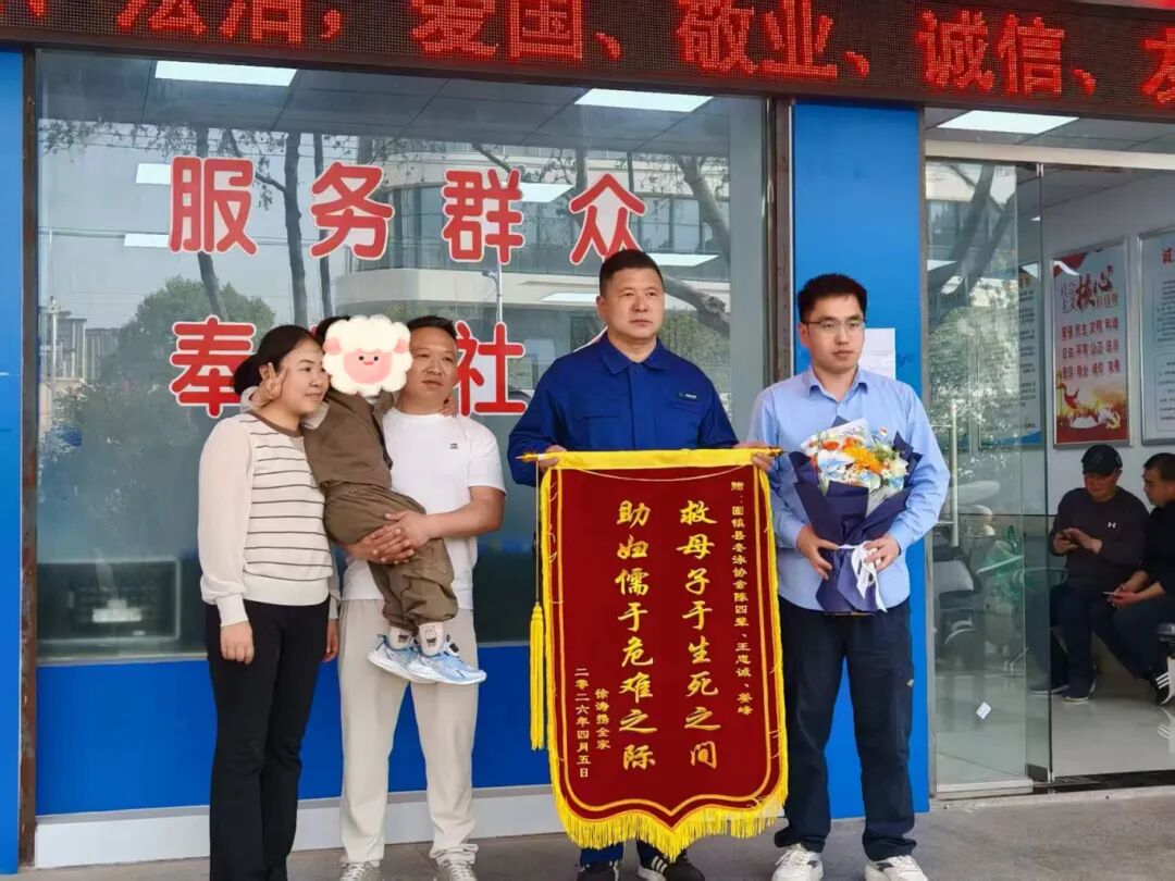 危难时刻显真情,感恩之心暖人心。4月5日上午,被救母子的亲属专程来到陈四辈所在的固镇中环水务有限公司,手里捧着鲜花和一面印着“救母子于生死之间 助妇孺于危难之际”的锦旗,当面向陈四辈、王忠诚、姜峰三位救人者表达最诚挚的感激之情。