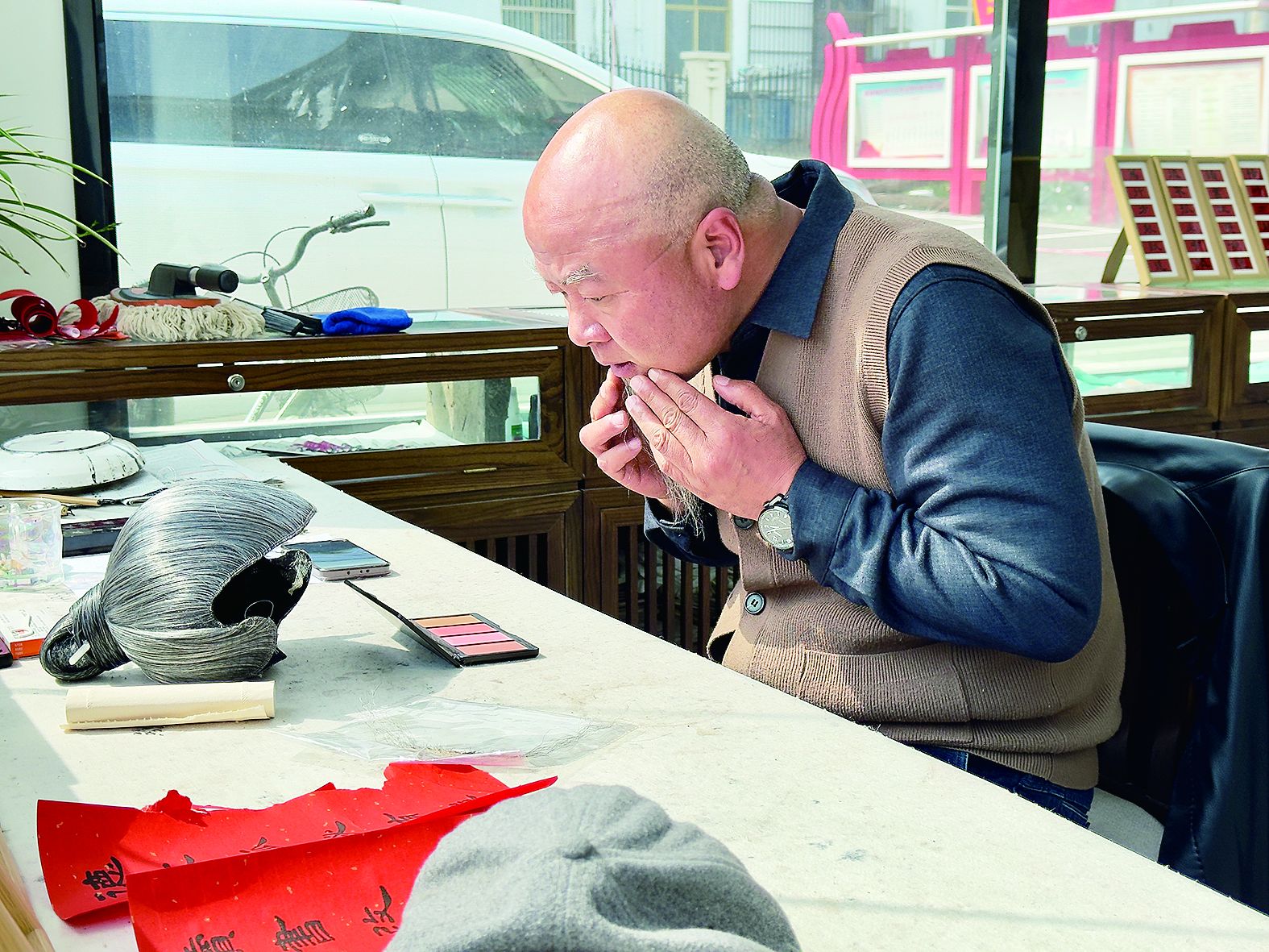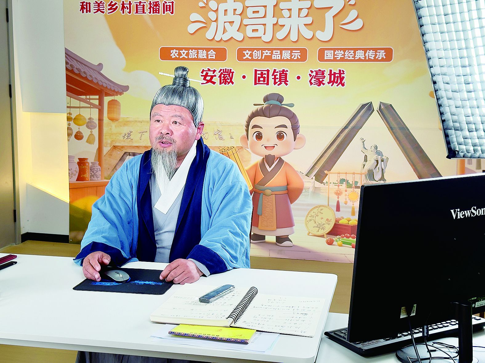 下午三点半,在固镇县濠城镇公共文化服务空间里,邢波对着镜子,细心整理汉服衣襟、佩戴古风头饰、粘上仿真胡须,一套流程下来足足半小时。作为公共文化服务空间负责人、抖音上小有名气的“波哥来了”,邢波正为每天下午四点准时开启的和美乡村直播做最后的准备。