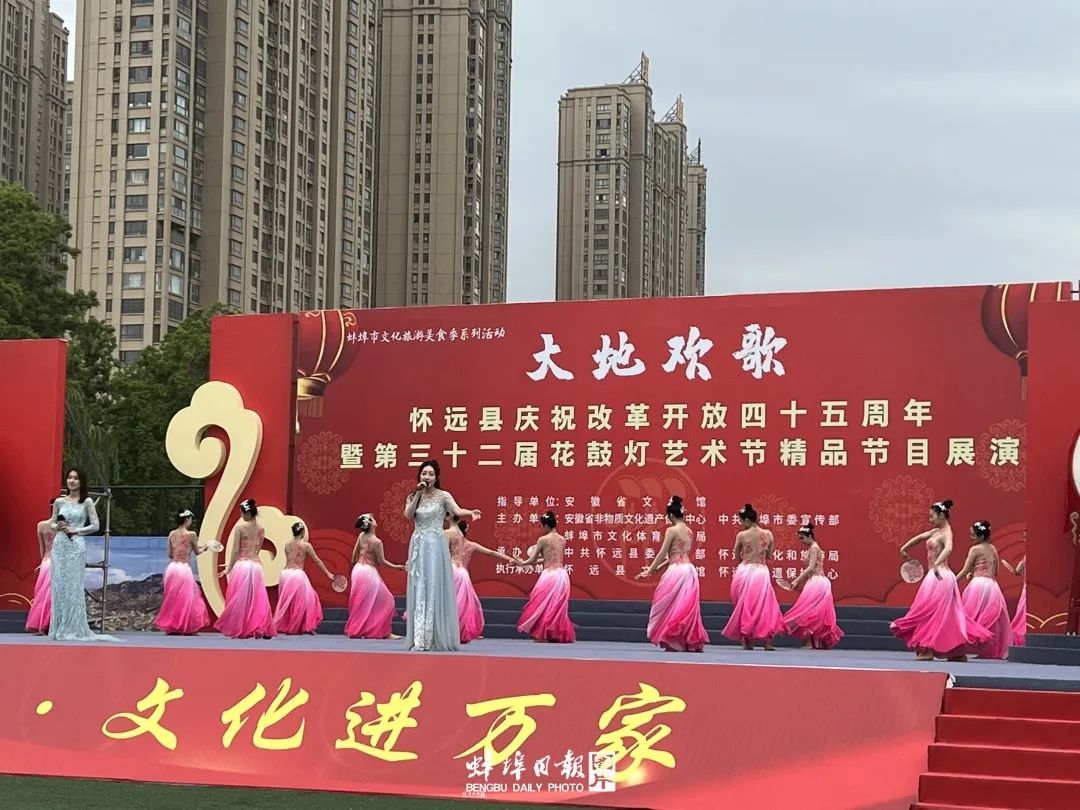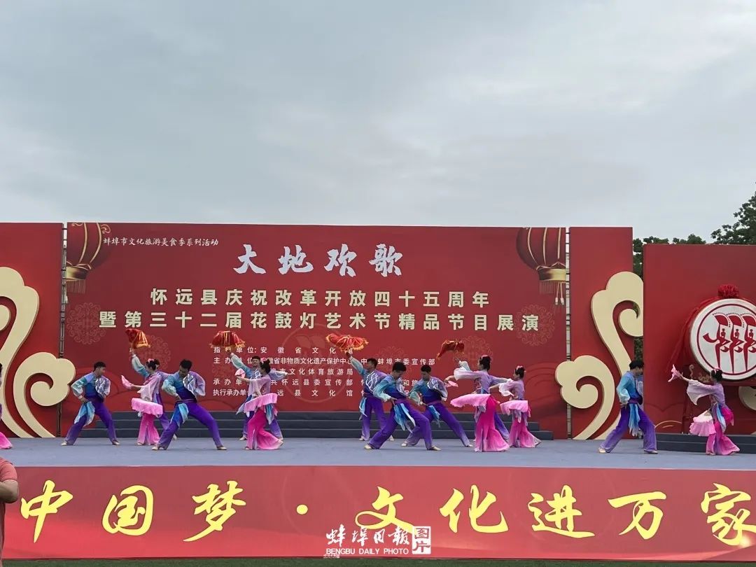 节目时而诙谐,时而童真,时而动感,时而柔美,看得大家如痴如醉,掌声不断。在花鼓灯抵灯展演环节,来自怀远县十八个乡镇的老百姓,也为大家展示各自的看家节目。
